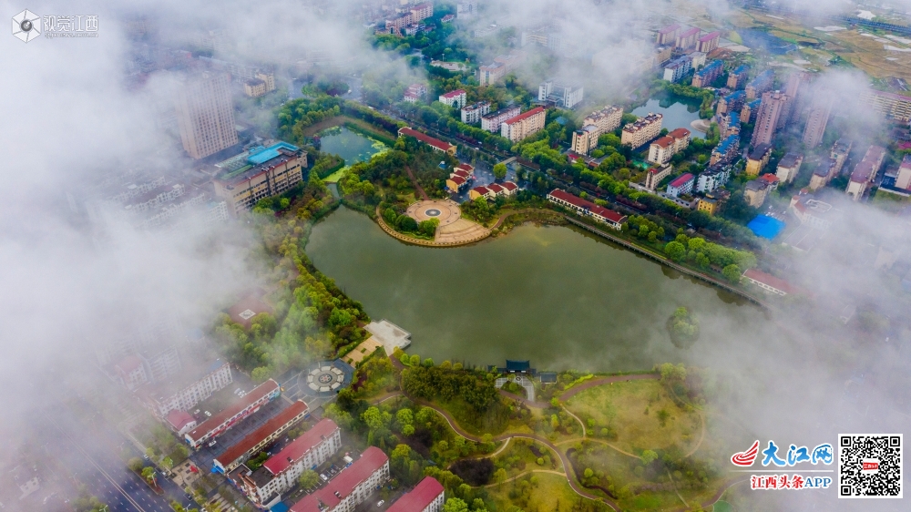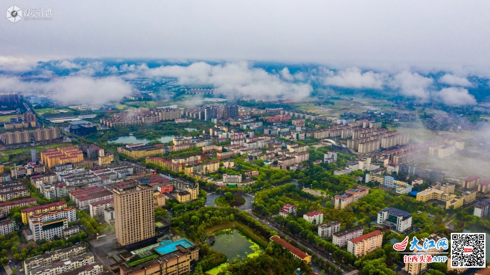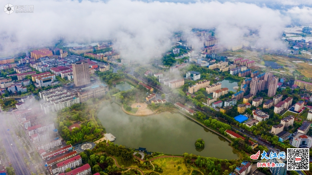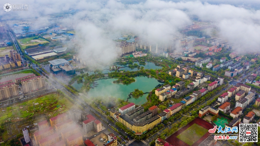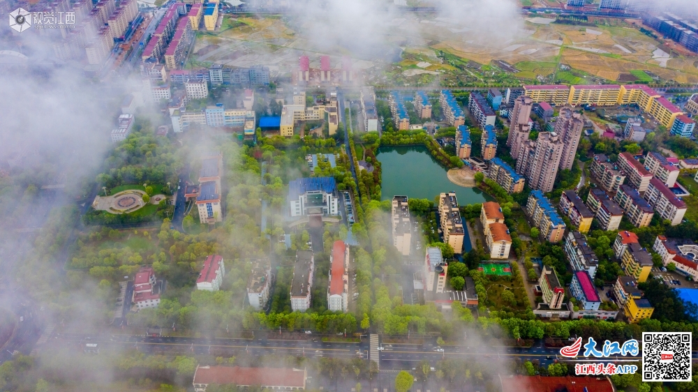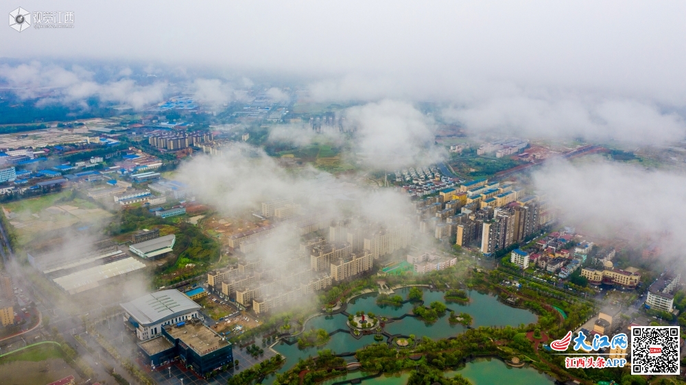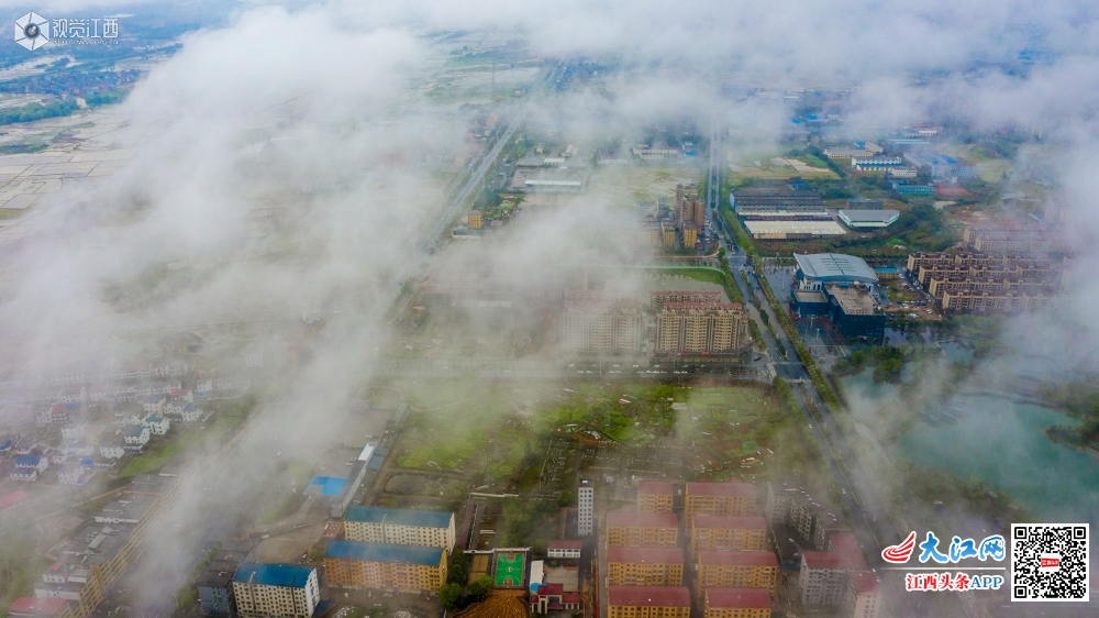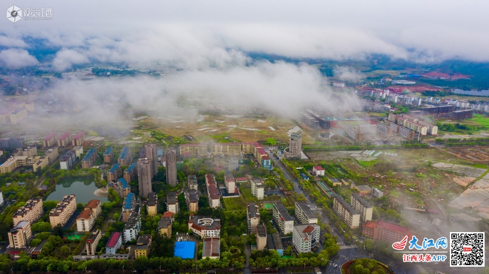 3月22日,经过周末雨水的洗礼,江西省峡江县城区出现云海景观,一层层雾气仿佛一条轻柔的长纱拂过城区的楼宇,蔚为壮观。从二百多米高空的航拍镜头中可以看到,雪白的雾气在城区大楼间翻滚,整个城区云雾缭绕,如诗如画,似梦似幻,宛如仙境。