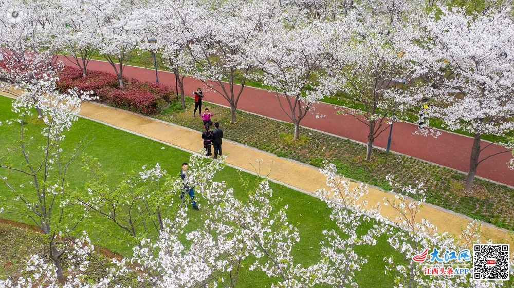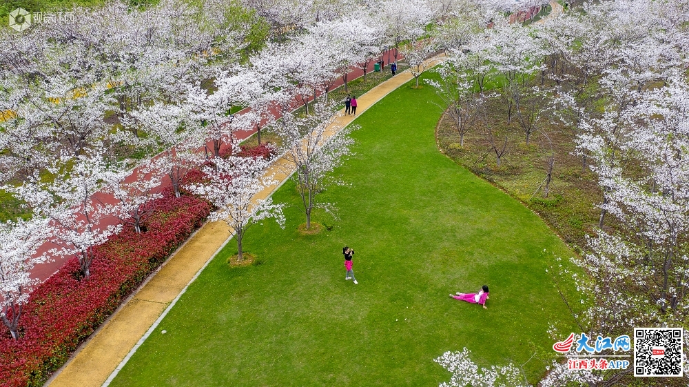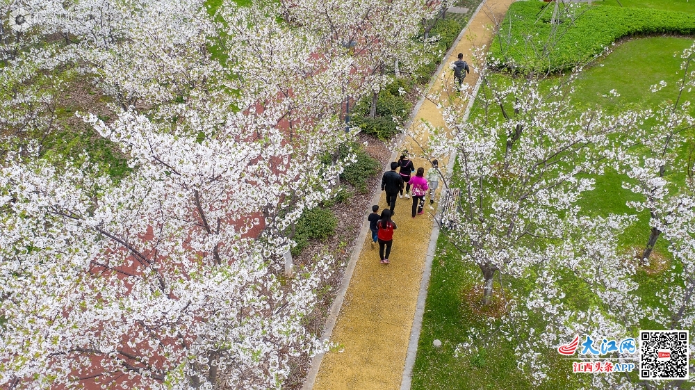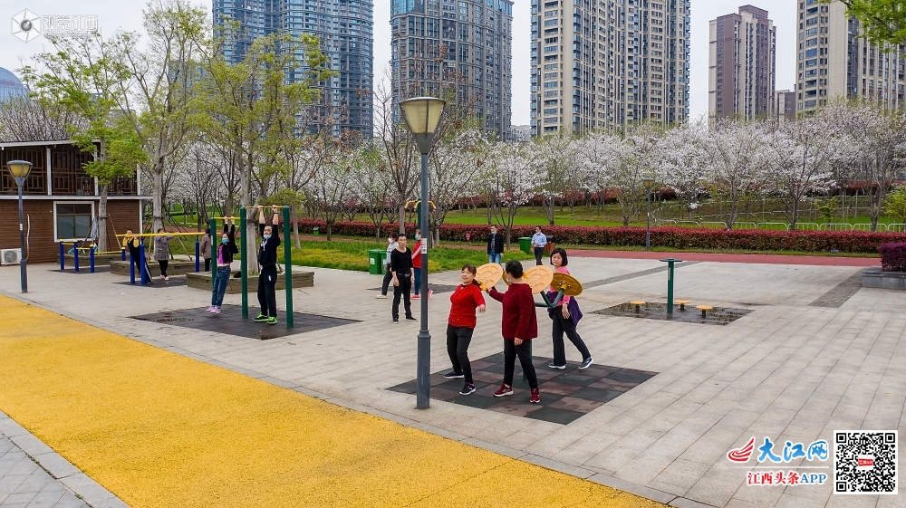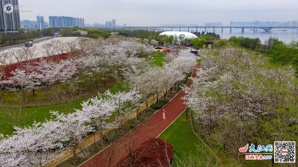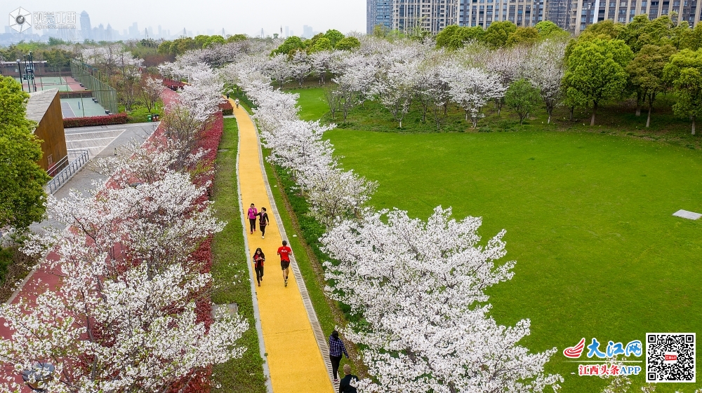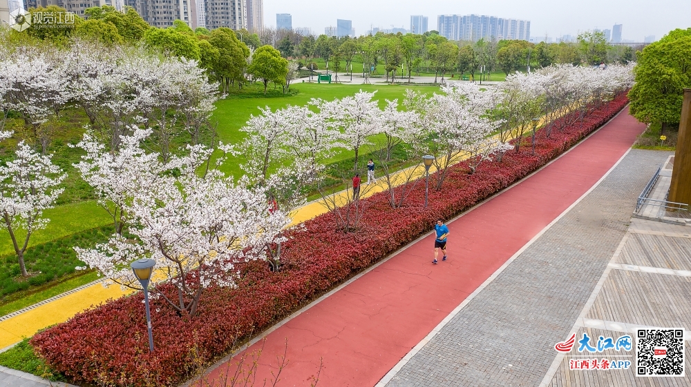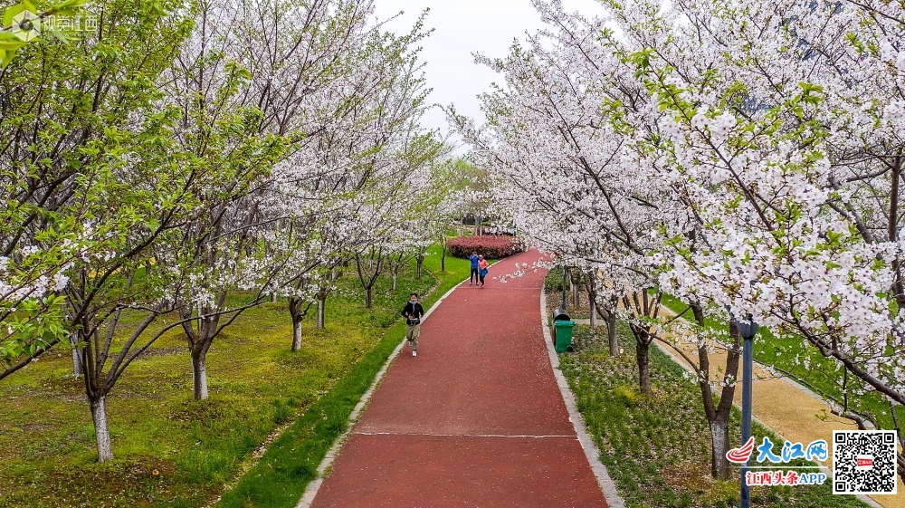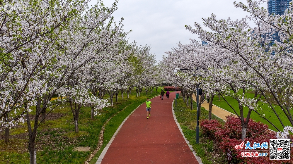 2020年3月24日,江西省南昌市赣江东大堤风光带春意盎然,樱花盛开,令人心旷神怡,随着新冠肺炎疫情风险等级降低,清晨不少市民趁着春光来这里漫步、锻炼。