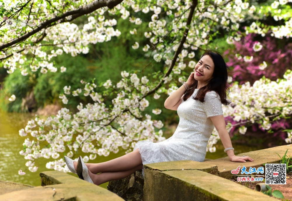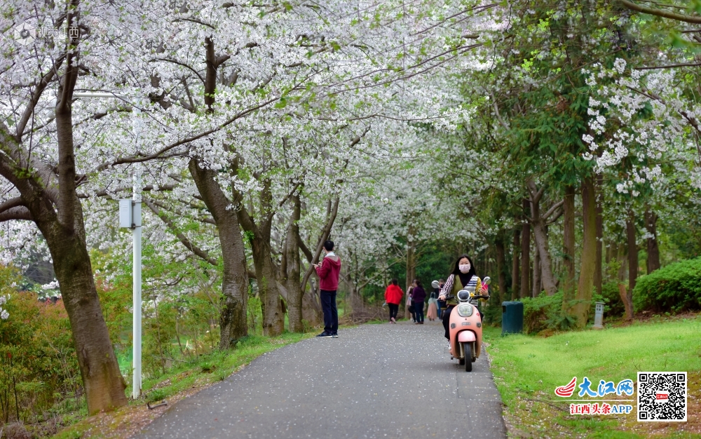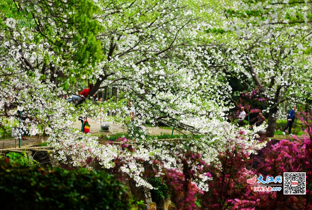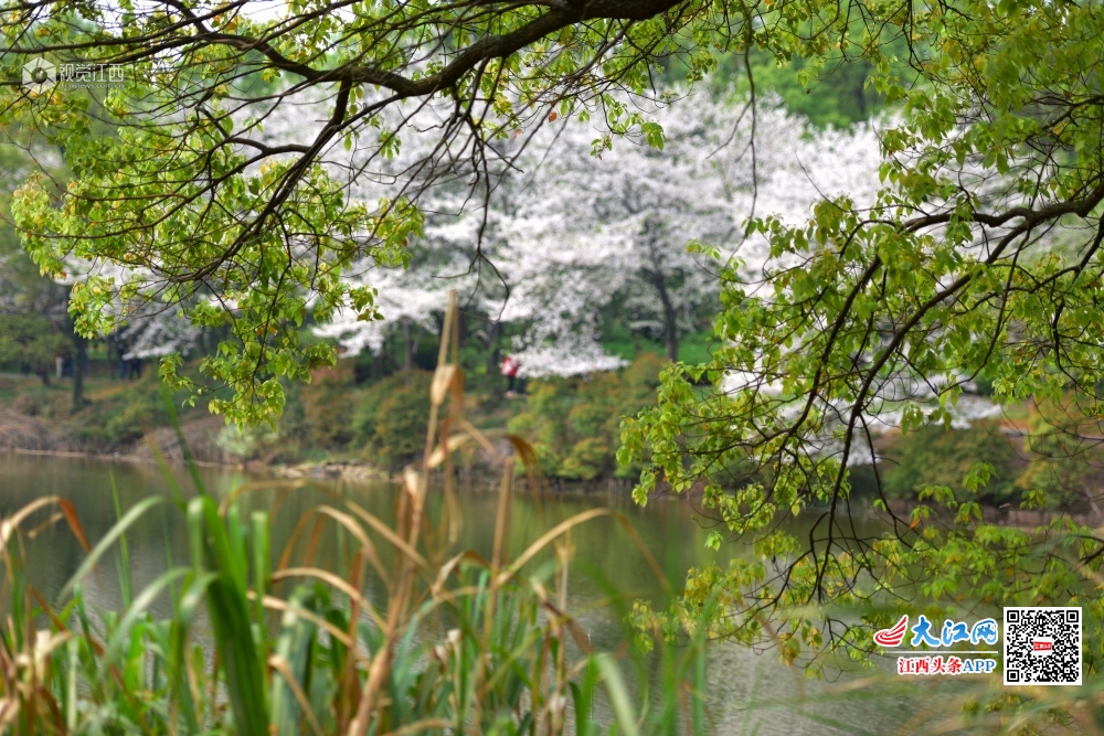 2020年3月25日,江西省林科院生态自然园樱花绽放,满树樱花,芳菲争艳,配上湖光景色美不胜收,吸引了市民前来赏花拍照。
