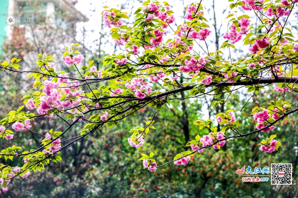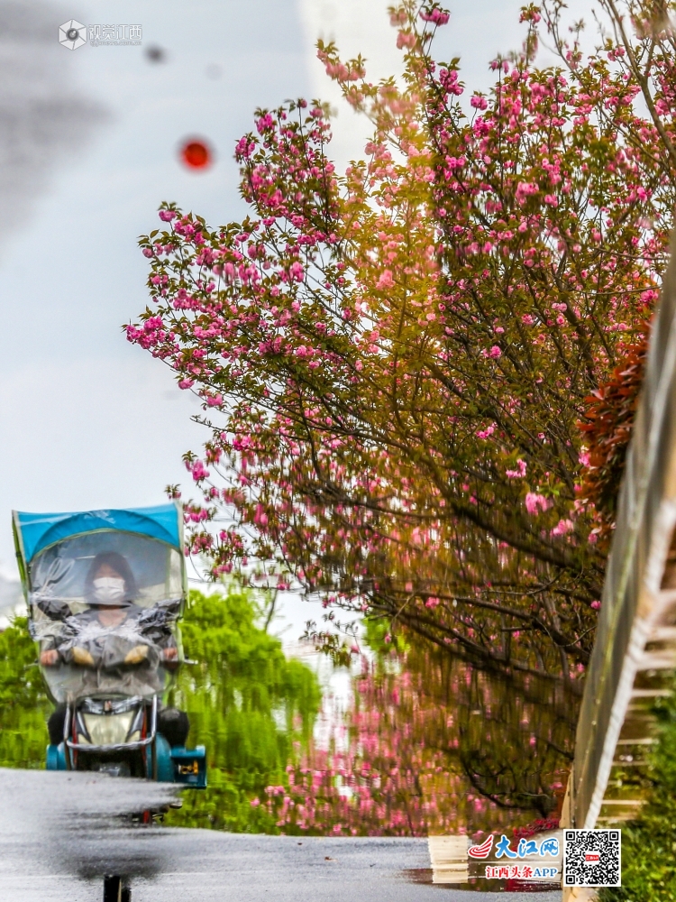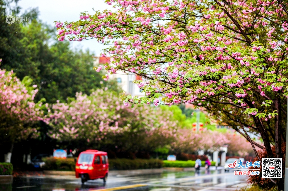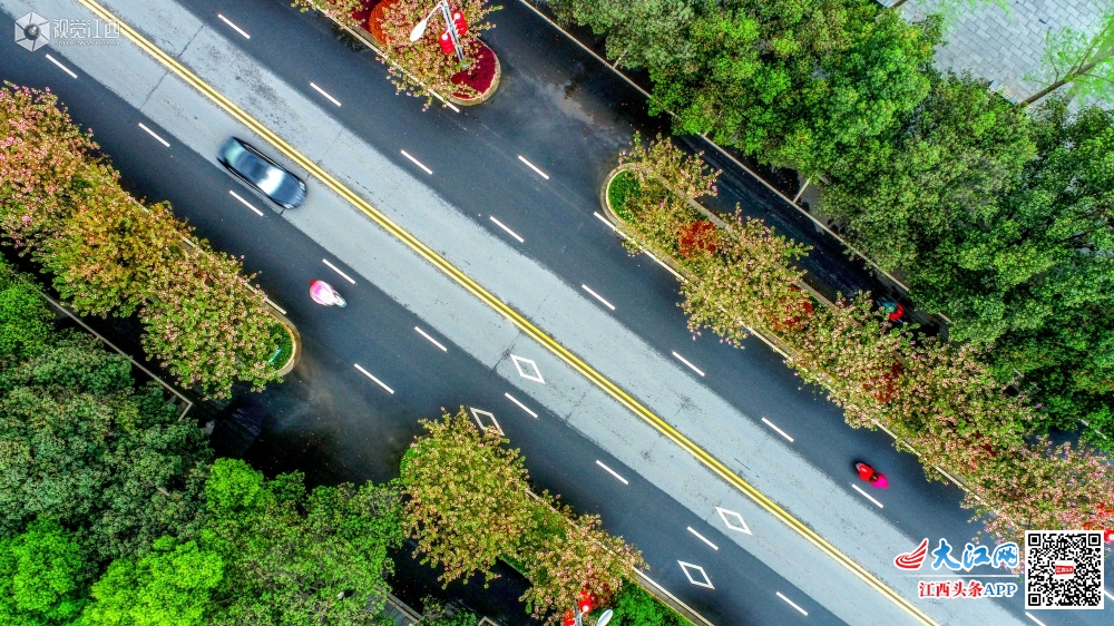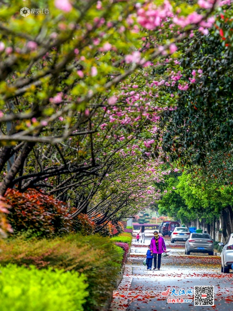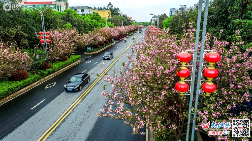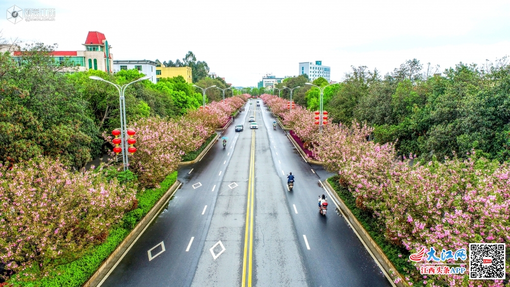 近日气温回升,江西省吉安市峡江县水边镇玉笥大道两旁的?;ň合嗫?,一树树重重叠叠的?;ǚ酆烊缦肌?000米长的“?;ù蟮馈背晌拷鞘芯肮鄣囊淮龇缇跋?。