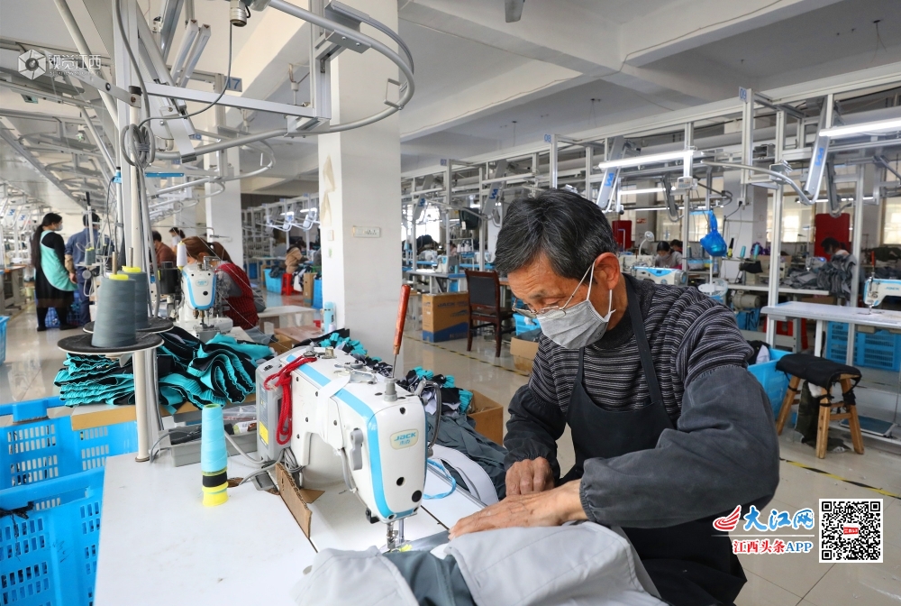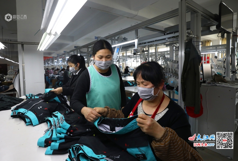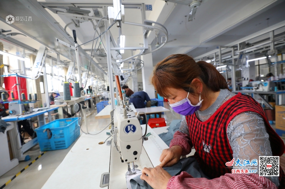 复工一个多月的江西省莲花县海伦制衣厂车间里,缝纫机的“哒哒声”此起彼伏,100多名工人正在各自的工位上紧张有序地忙碌着,这家工厂生产的服装将出口欧美国家。图为3月26日,车间一角工人正在缝制衣服。