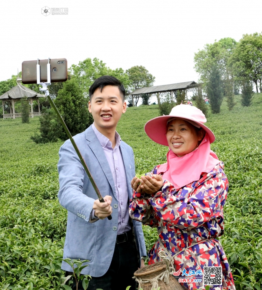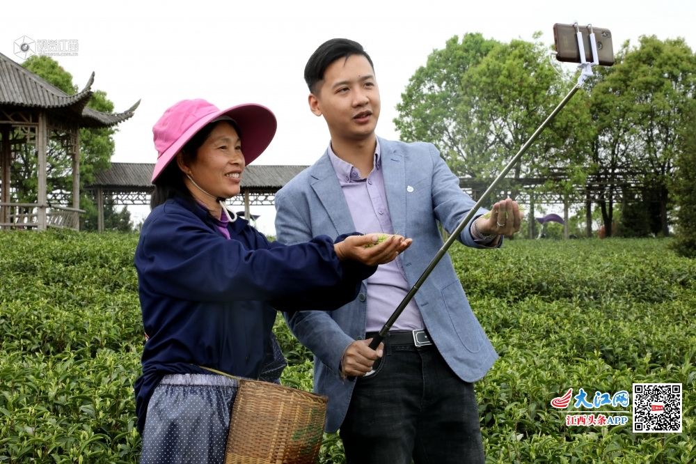 2020年3月26日,在江西省吉安市永丰县鹿冈乡灵华山有机白茶扶贫基地,当地扶贫干部曾叙恺正通过手机直播,拓宽基地春茶销售渠道,吸引游客前来参观,帮助村民增收。