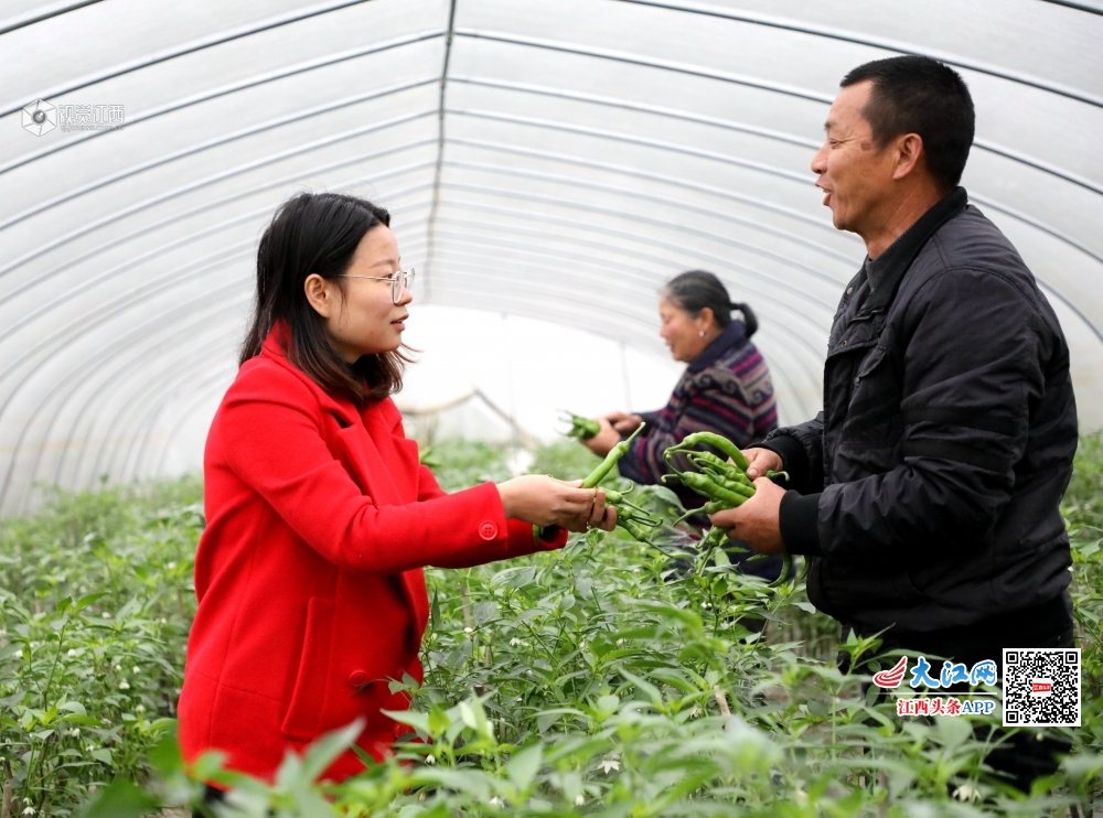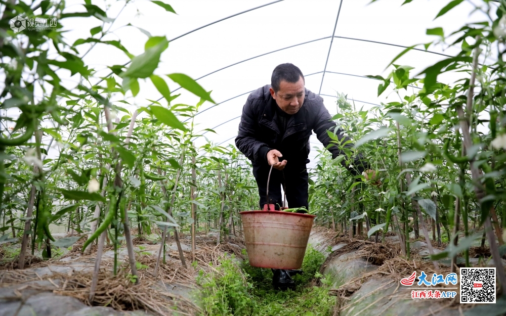 2020年4月2日,在江西省吉安市永丰县潭城乡舍陂村,当地农民陈燕俊正在采收订单辣椒。陈燕俊潭城乡舍陂村2013年建档立卡贫困户,目前发展了6亩大棚蔬菜,通过精细管理和技术扶持,达到了一亩耕地三季菜,一年收入两万块的稳定脱贫致富目标。