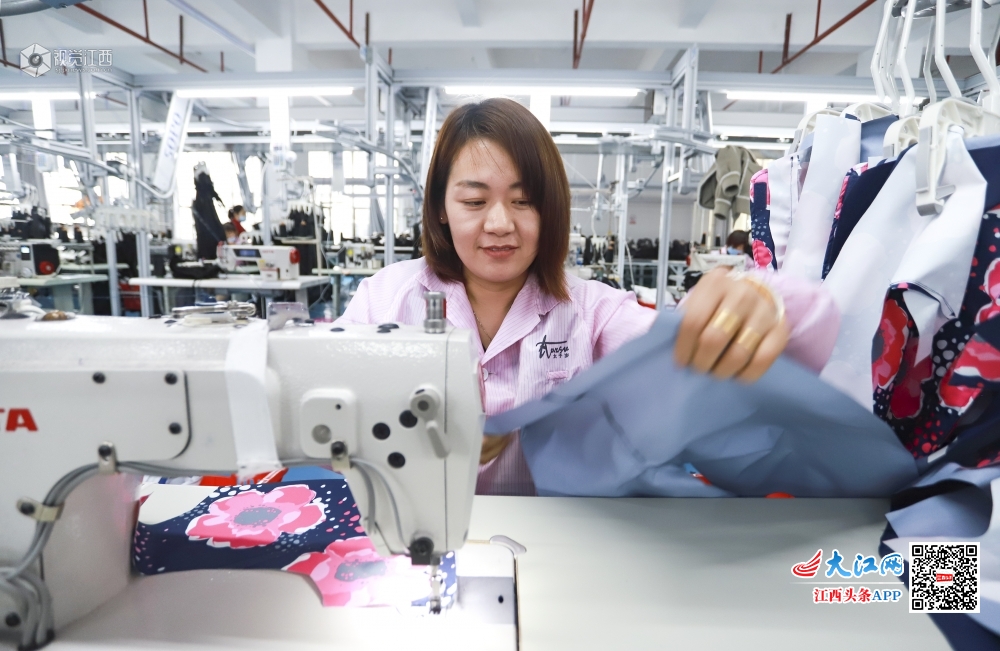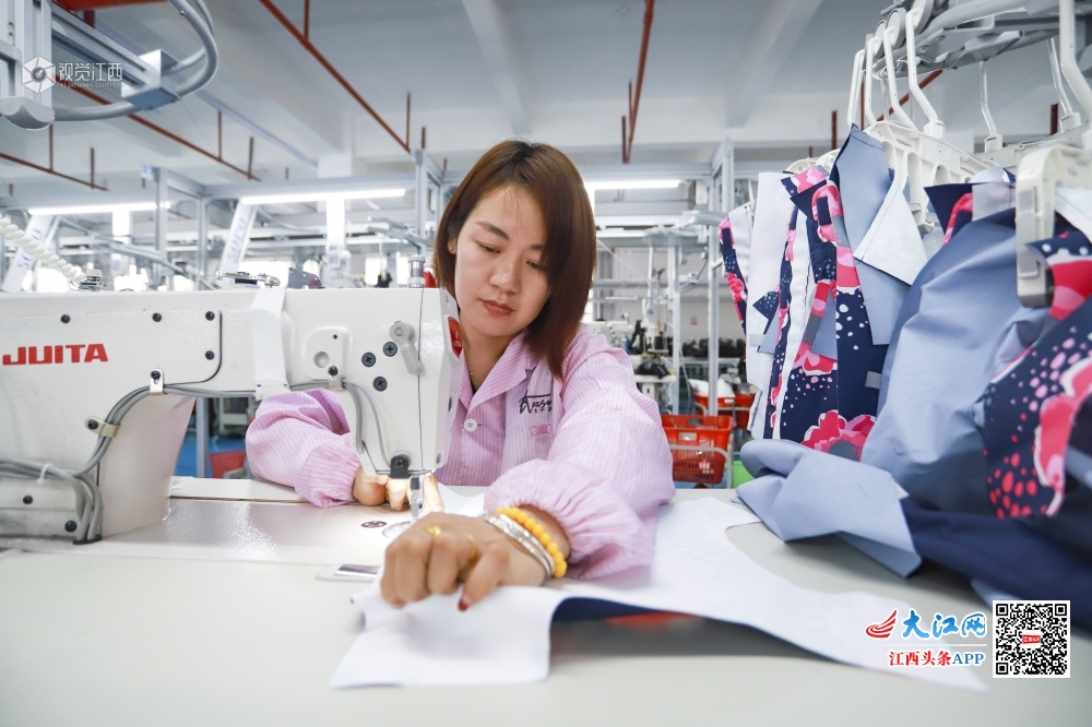 2020年4月5日,江西省九江市湖口县高新技术产业园区内的太子岁服饰生产车间一片繁忙,工人正在加紧赶制出口订单。