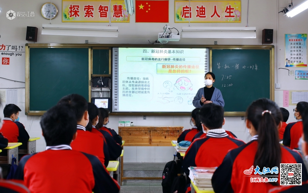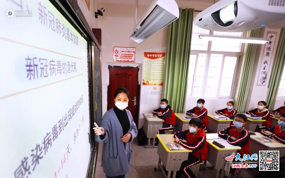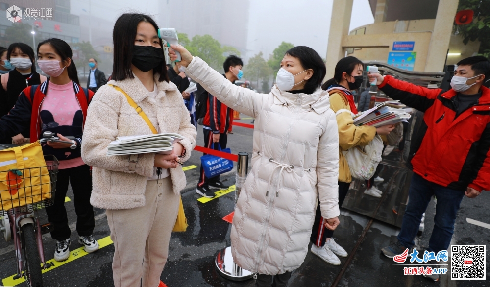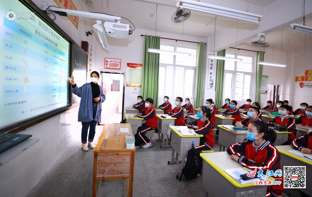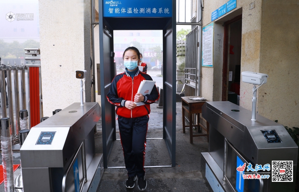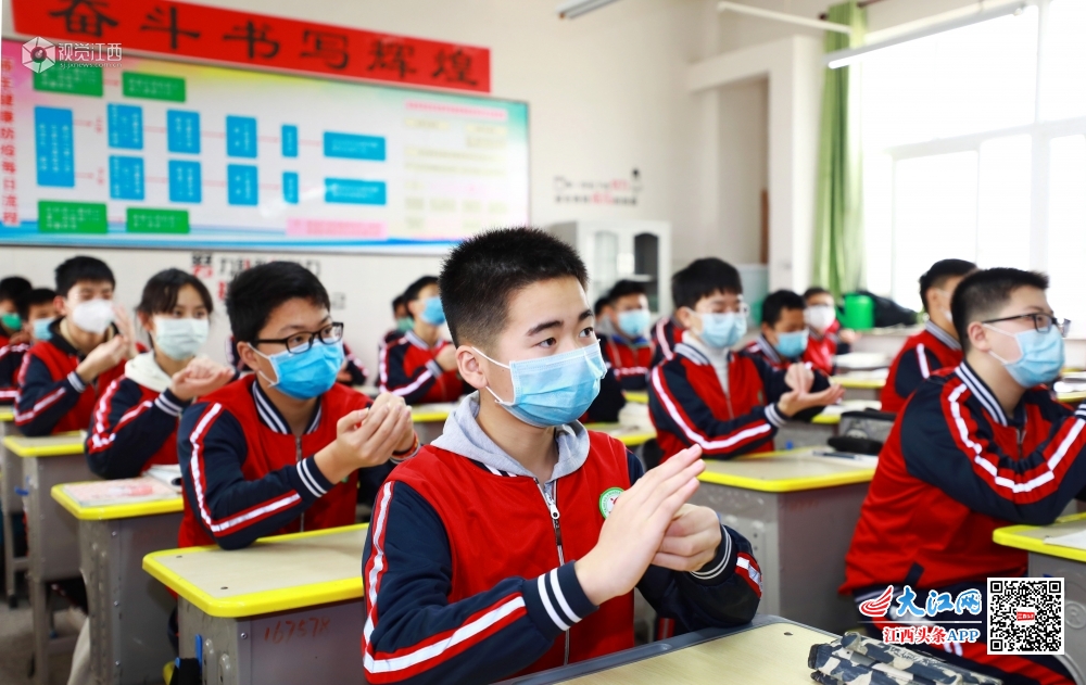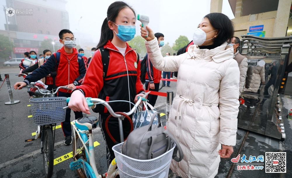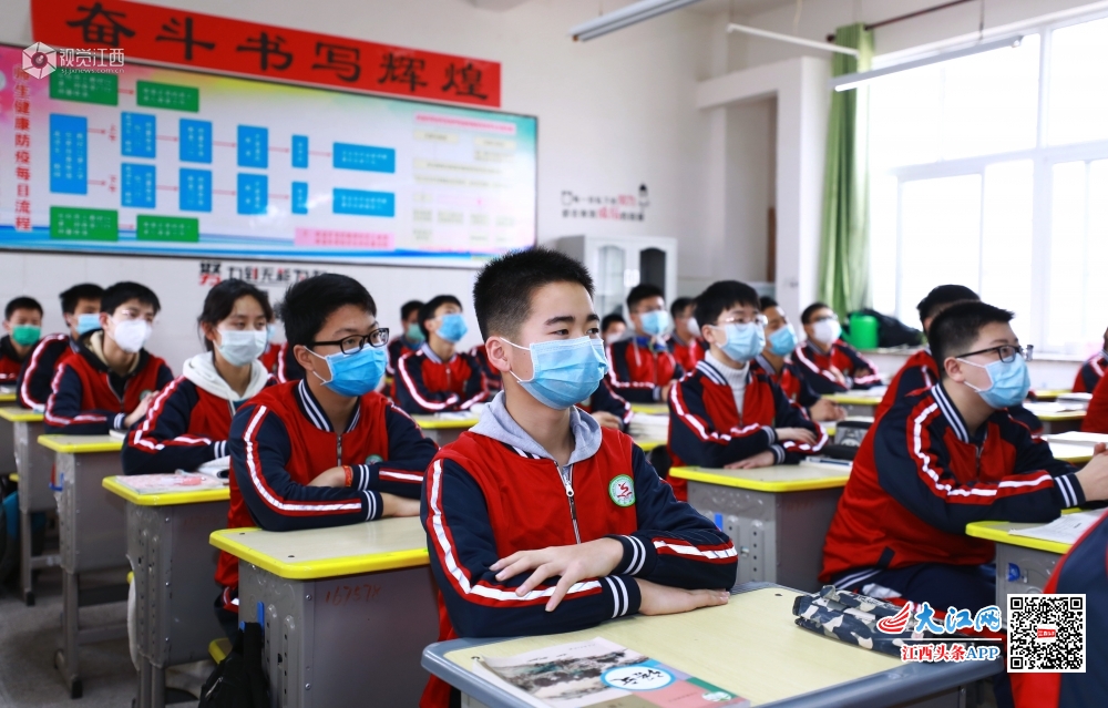 2020年4月7日,江西省吉安市泰和县各所中学在严格做好疫情防控措施的前提下,初三、高三和中职毕业年级学生重返校园,开学复课。学生们在老师、安保等工作人员的引导下,佩戴口罩,测量体温,有序进入教室上课、食堂用餐,一切井然有序。