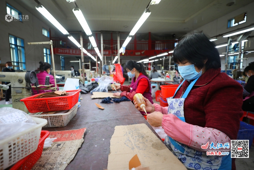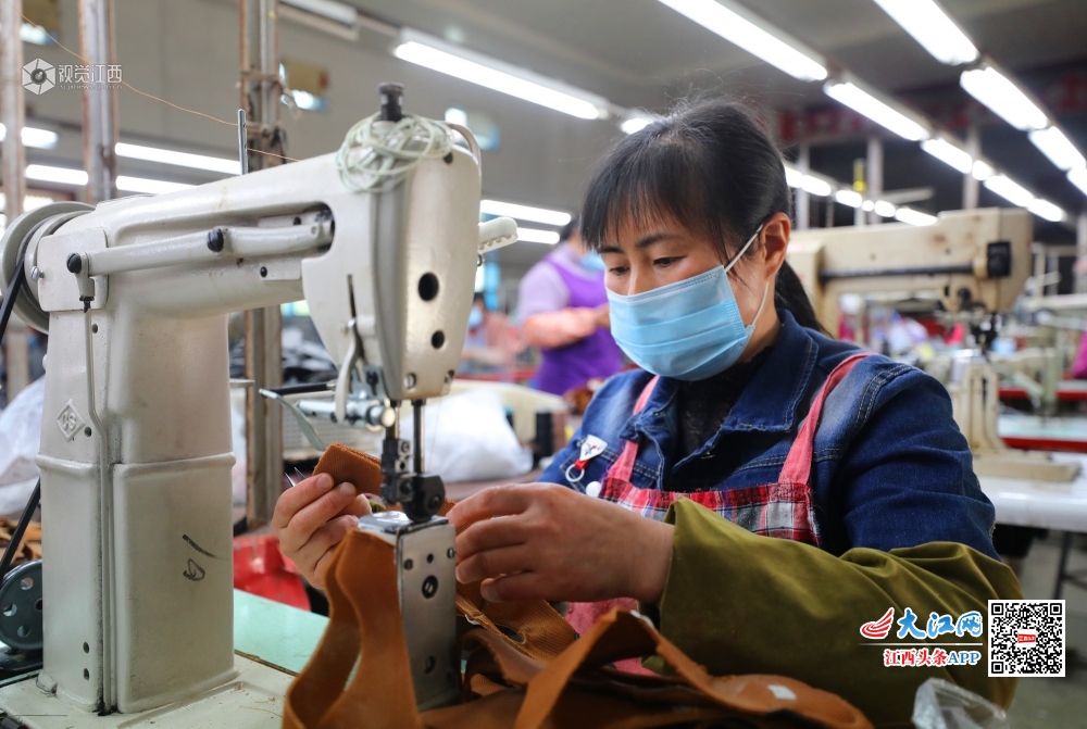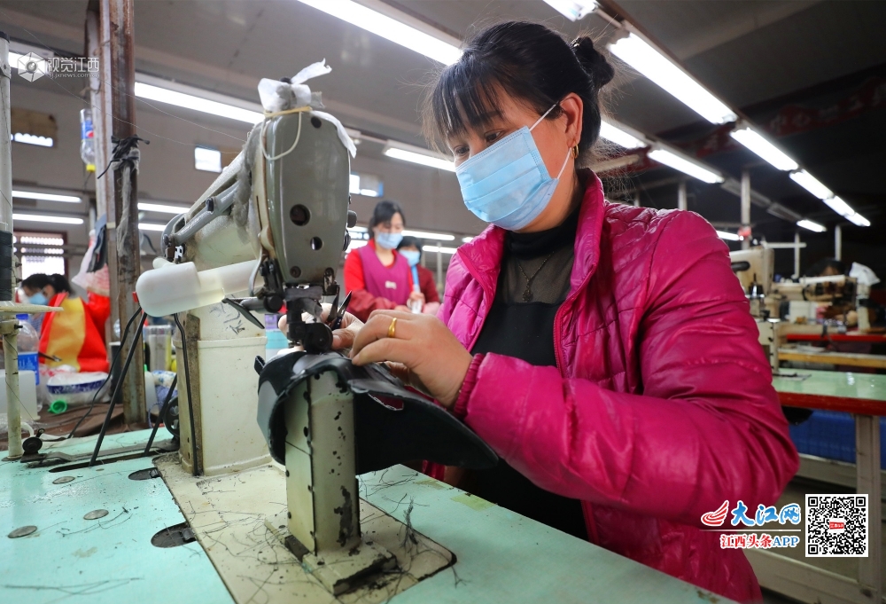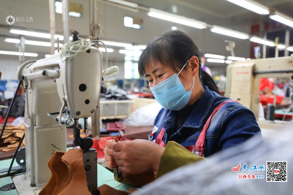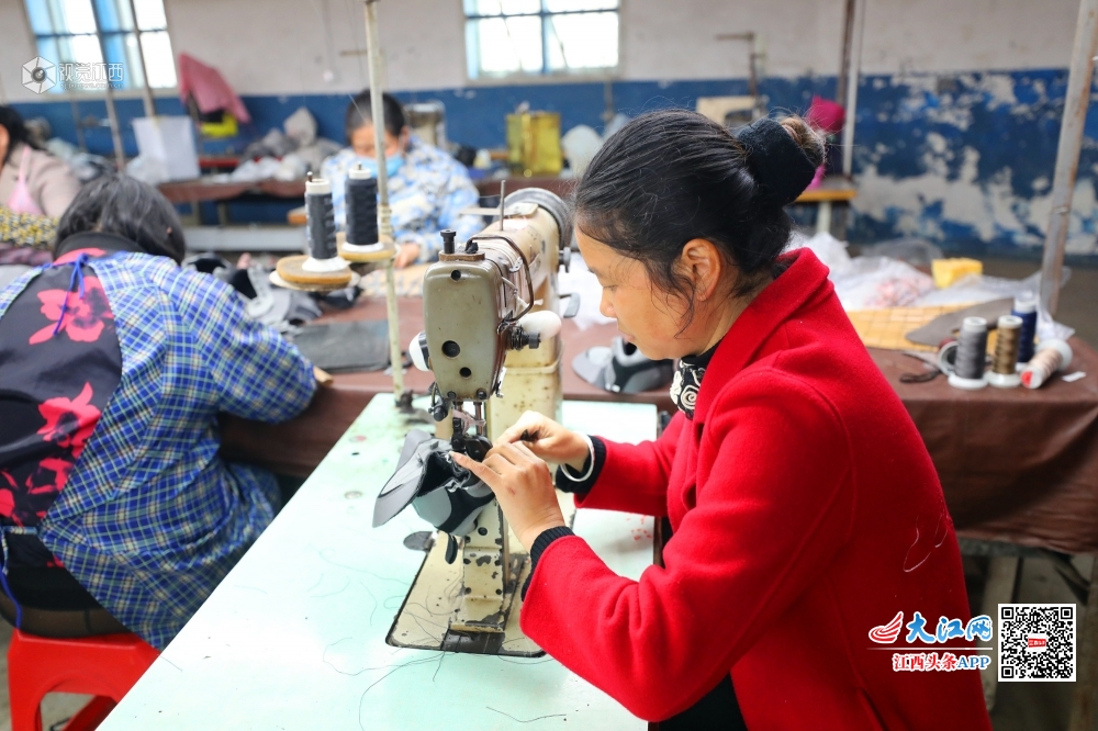 4月8日,在江西省莲花县路口镇庙背村扶贫车间,一名女工正在熟练地用缝纫机加工鞋面。这家扶贫车间是广州一家外贸出口企业的加工点,每个月能生产一万多双鞋面。在这里务工的贫困户和其他村民平均每月能领到2000多元的工资。