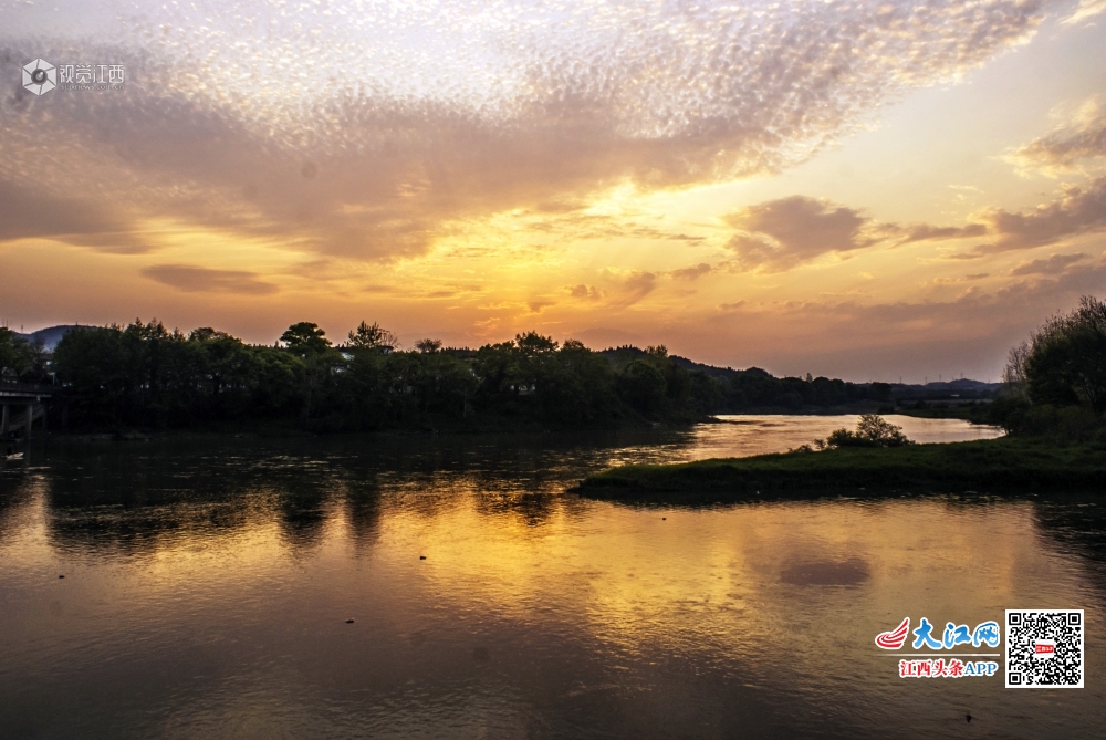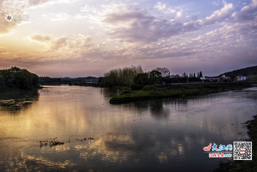 在袁河与杨溪河畔交汇处的江西省分宜县洋江镇杨潭村,两面环河,风光旖旎,2020年4月9日的傍晚,彩霞映照,格外诱人。