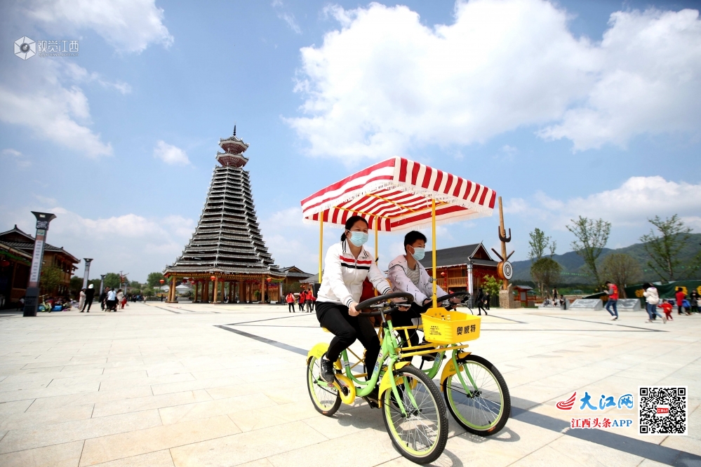 4月12日,游客在江西省吉安市峡江县金坪民族乡民族风情园游玩。据了解,峡江县落实周末2.5天弹性作息、景区门票优惠、免费发放消费卡券等8条“给闲又给钱”的硬举措,倡导“本地人游本地、周边人游周边”,并号召广大干部职工发出带头进行旅游消费。