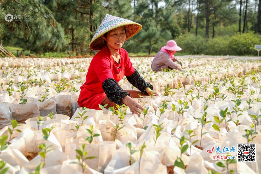 4月13日,在江西省吉安市峡江县林木良种场油茶培育基地,农民在管理油茶幼苗。近年来,江西省吉安市峡江县将高产油茶产业发展作为产业扶贫的重点产业,通过“基地+贫困户”等模式,引导贫困户参与油茶产业种植,延长油茶的种苗、栽培、加工、销售等油茶产业链,带动贫困群众增收。