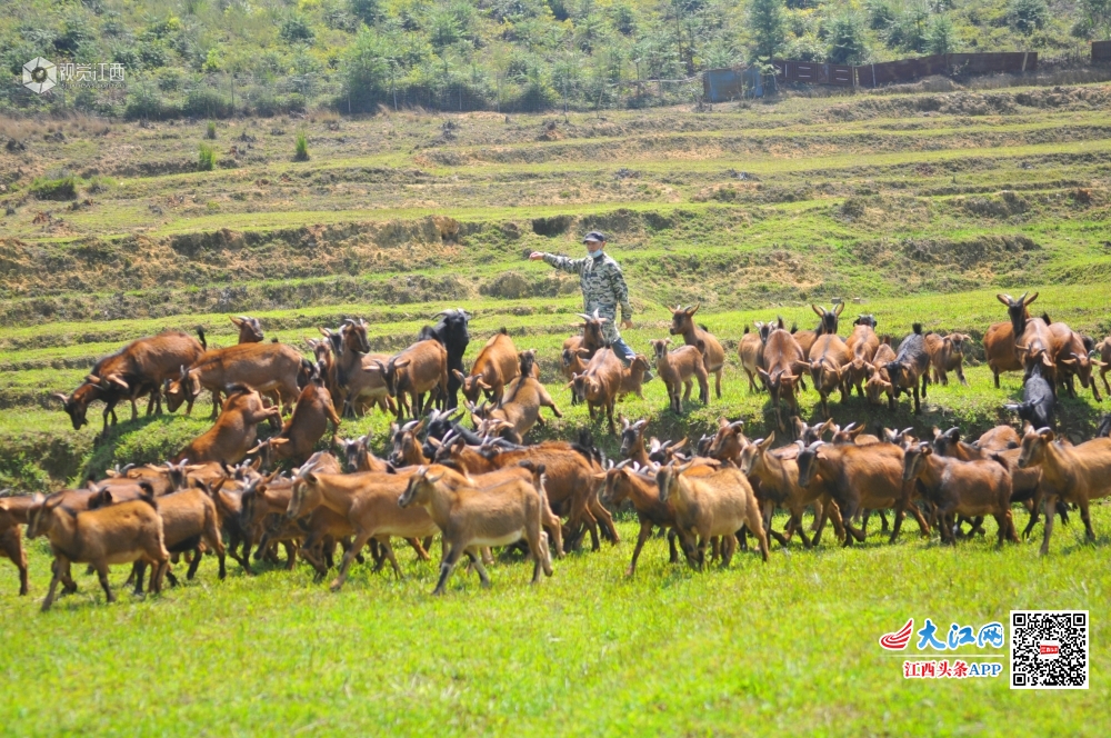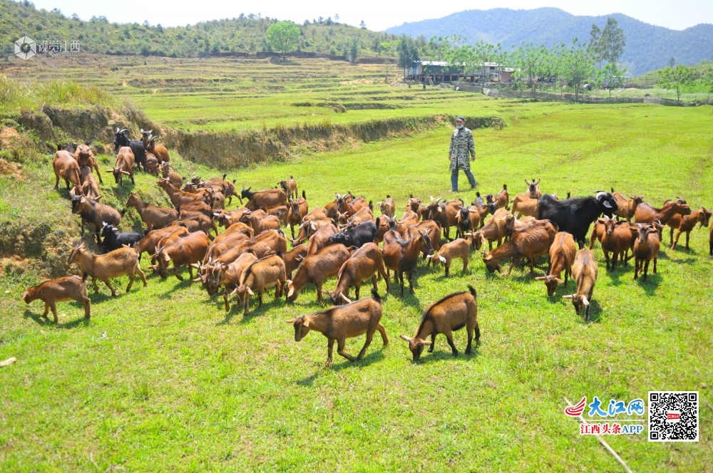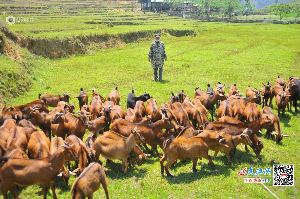 4月16日,在江西省赣州市全南县中寨乡筠竹村下朱屋扶贫产业基地,朱长生高兴地在山间放着他的一百多只山羊。
