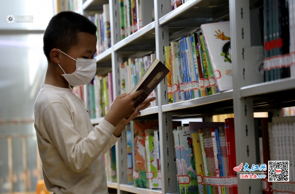 2020年4月17日,在江西省吉安市永丰县图书馆,不少读者在挑选书籍,他们戴上口罩,自觉做到不聚集不扎堆,防止交叉感染。