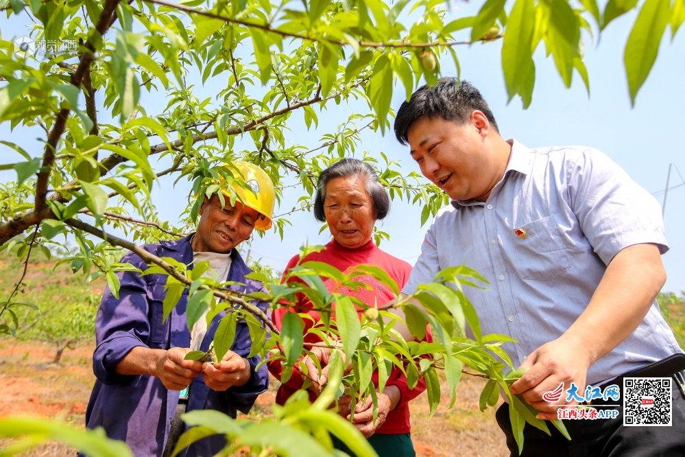 4月17日,江西省峡江县马埠镇上盖村“第一书记”陈毅强(右)和村民一起查看黄桃长势。峡江县精心挑选了80余名政治素质过硬、工作能力强的年轻党员干部,到脱贫任务最重、基础最差、难度最大的贫困村担任“第一书记”,助力乡村振兴,决战脱贫攻坚。