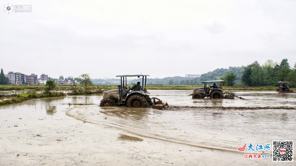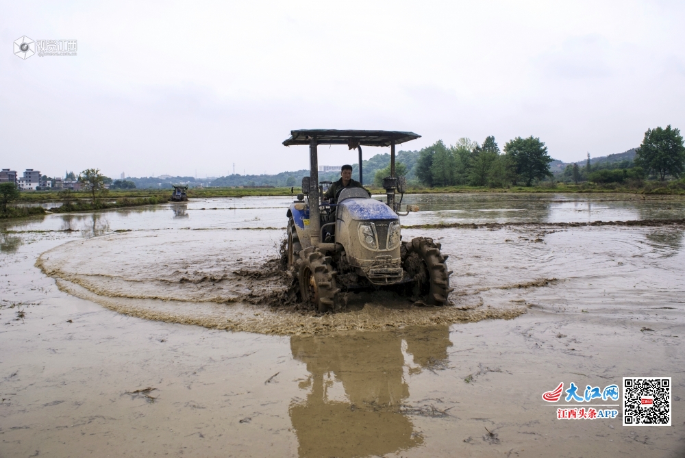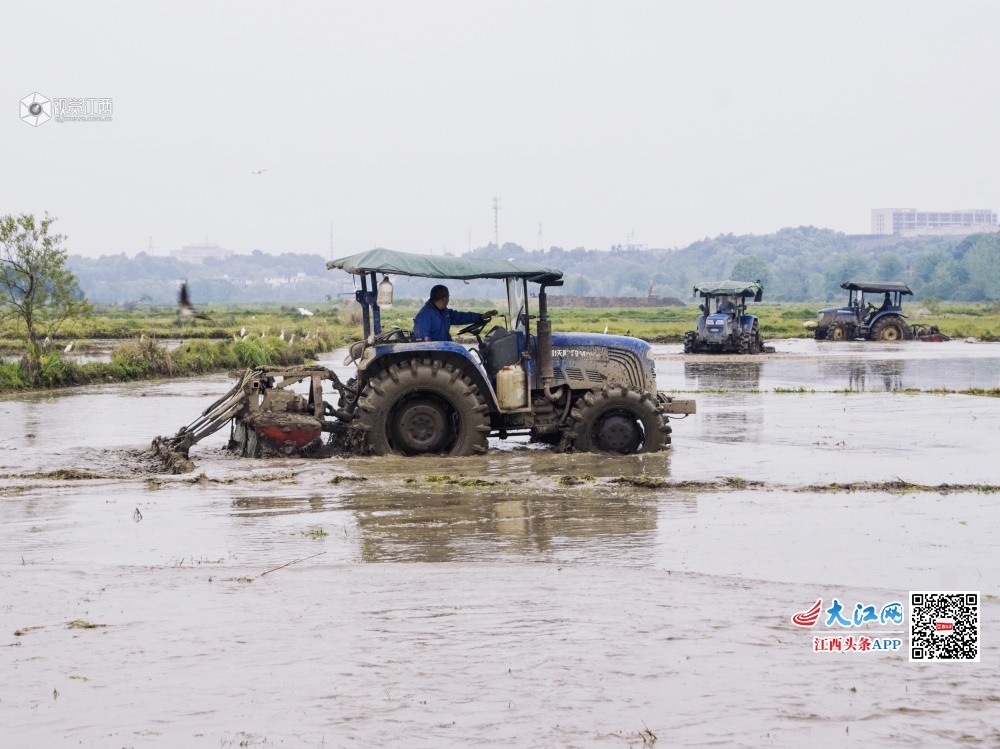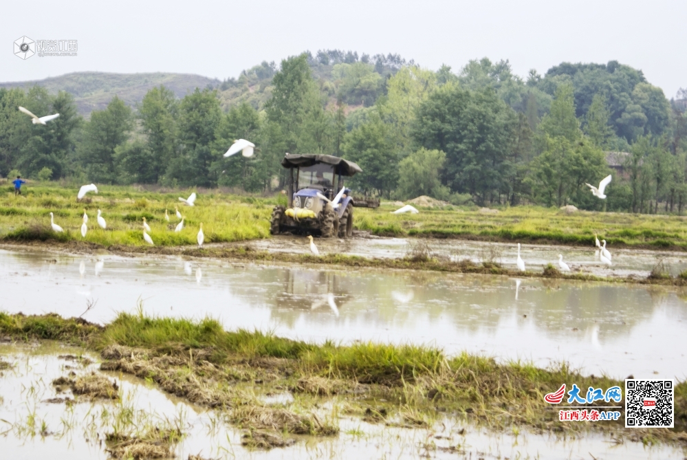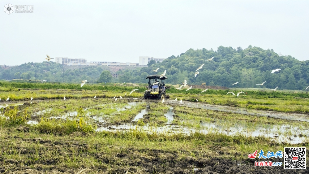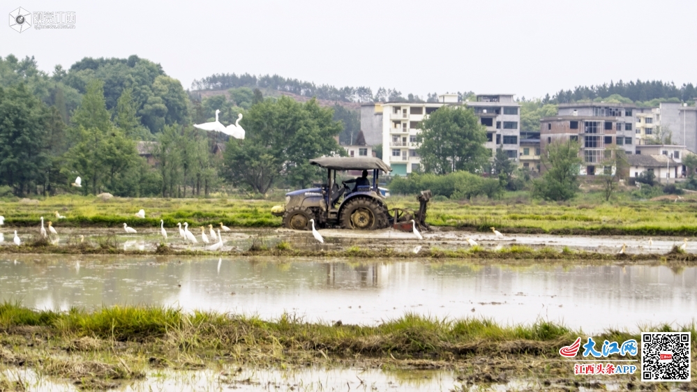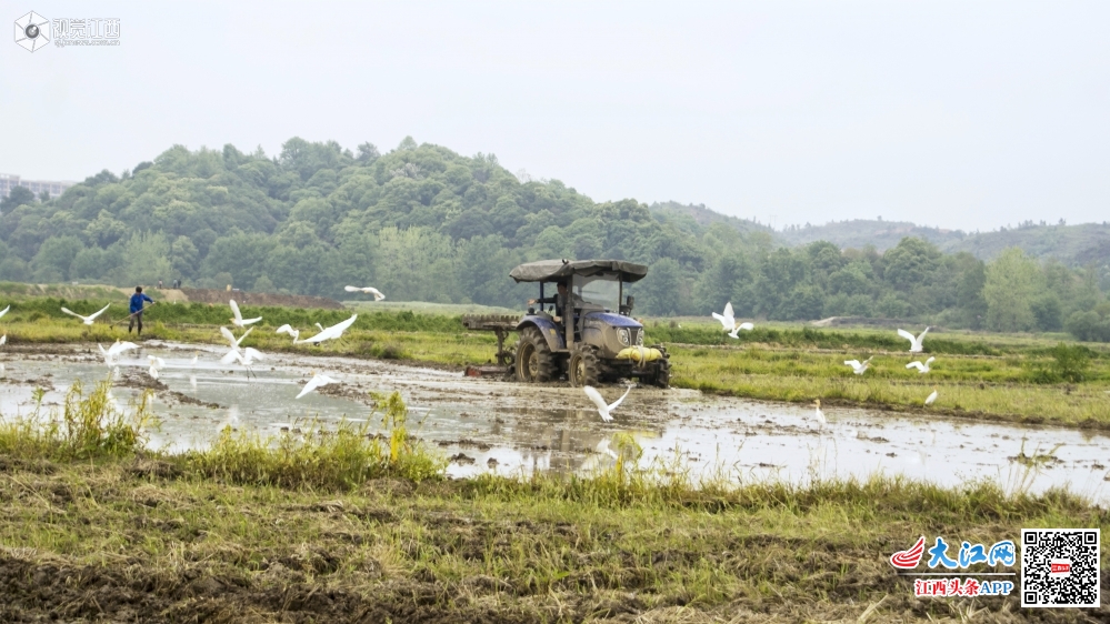 2020年4月18日,江西省宜春市经开区江丰社区的村民正在忙于春耕备耕,广阔的水田里,隆隆的机耕声,一群白鹭在田埂翔集,繁茂翠绿的树林中传来婉转的鸟鸣,好一幅人与自然和谐的生态图画。