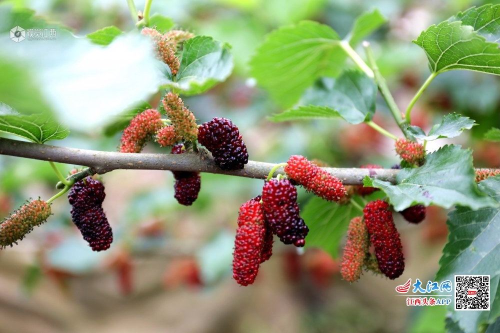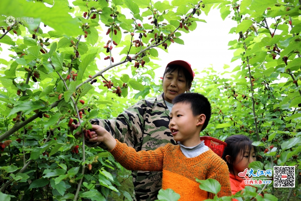 4月20日,游客在江西省分宜县钤山镇石枫村桑葚园里体验采摘乐趣。眼下正是桑葚陆续成熟的好时节,桑葚采摘园里,一排排桑树的枝头上,正挂着或青或红或紫的桑葚。近年来,石枫村因地制宜,积极发展乡村特色产业,走农旅融合之路,促进农民增收致富。