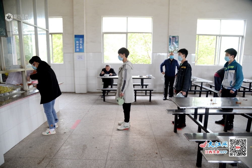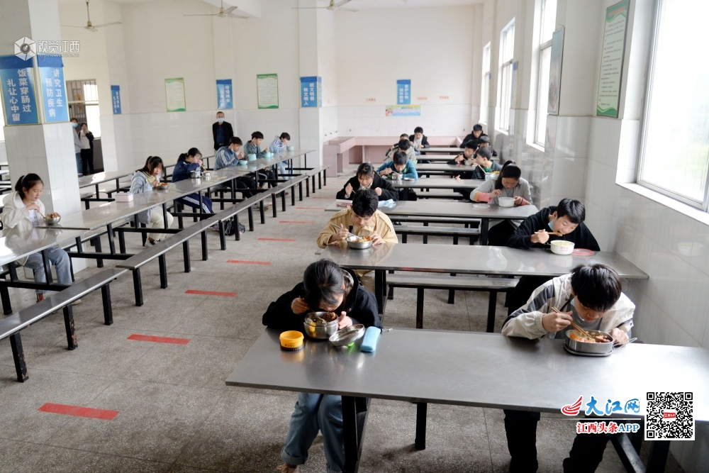 随着江西省高三、初三学生返回校园全面复学复课,如何让学生们吃得安全,成为各个学校防疫工作的一道“必考题”。4月22日,在南丰县市山中学食堂内看到,该校加强餐饮安全闭环管理,学生自带就餐用具,排队取餐间隔1.5米,两人一桌,间隔1.5米,错峰就餐分餐吃等措施,为学生舌尖上的安全保驾护航。