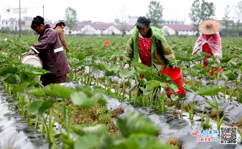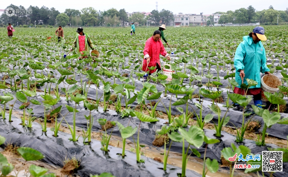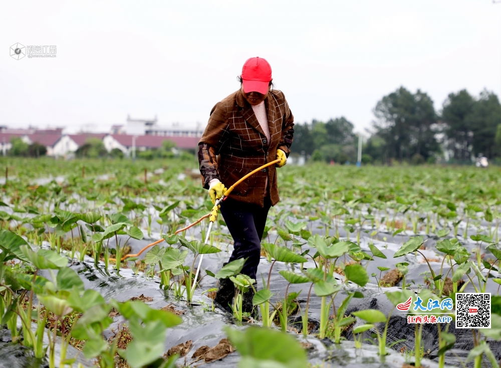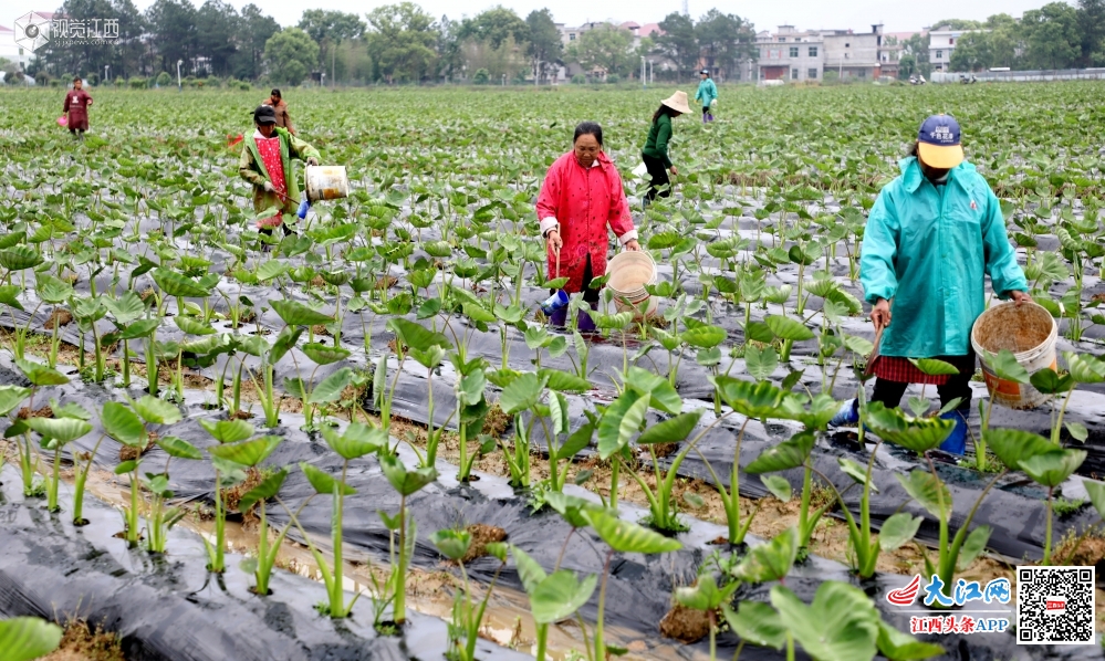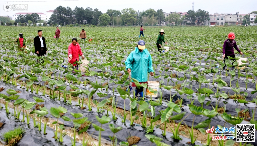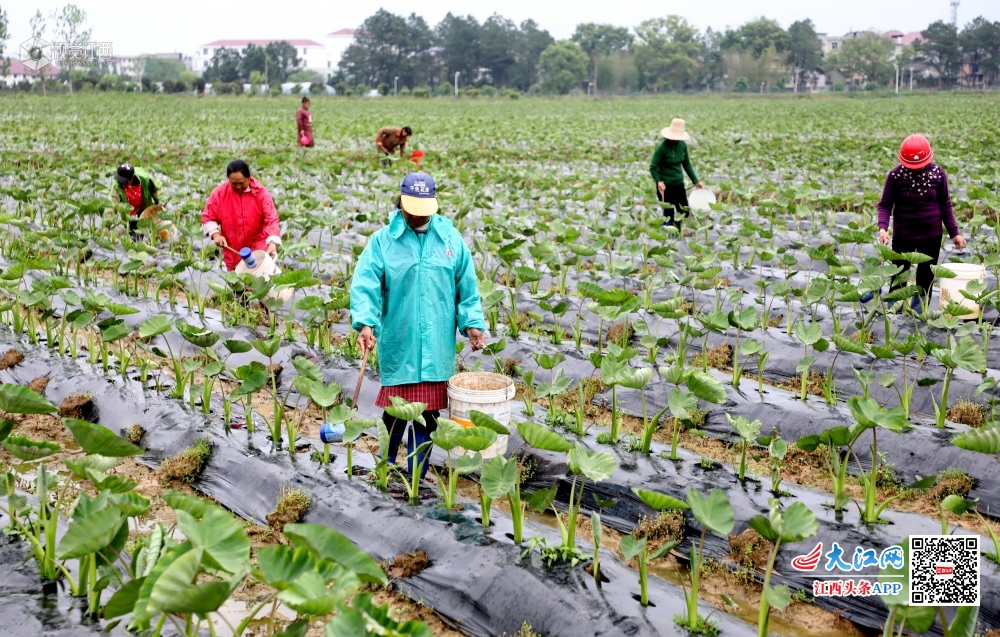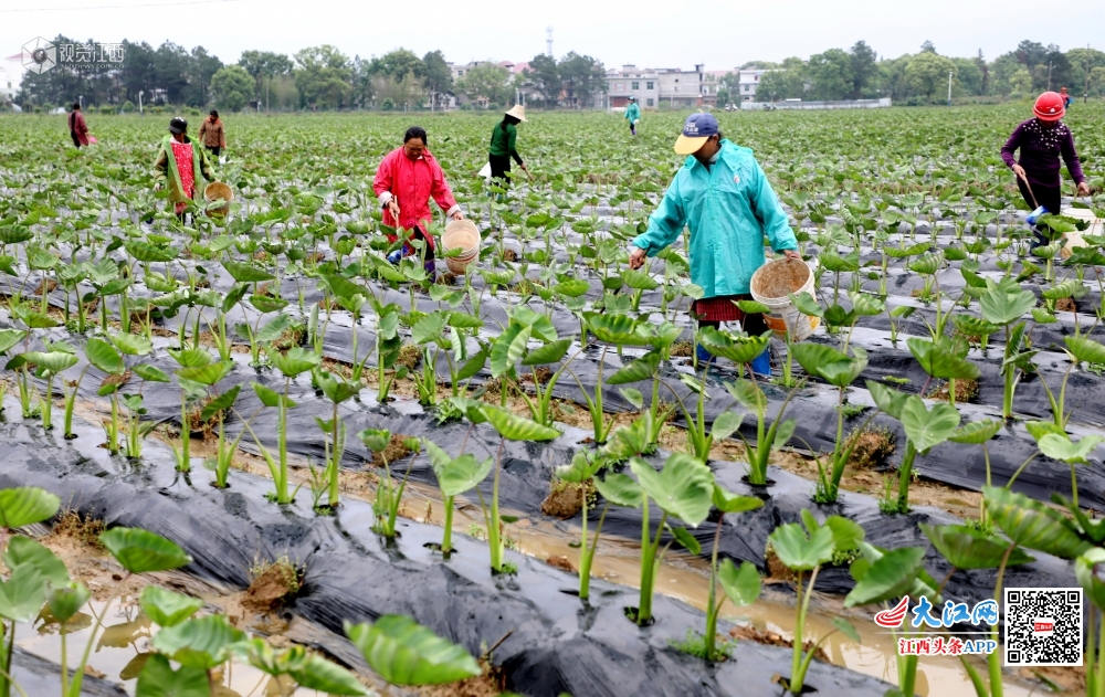2020年4月21日,在江西省永丰县佐龙乡罗家村槟榔芋示范种植基地,当地留守妇女正在进行田间管理,增加家庭收入。