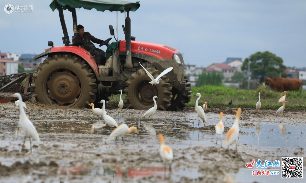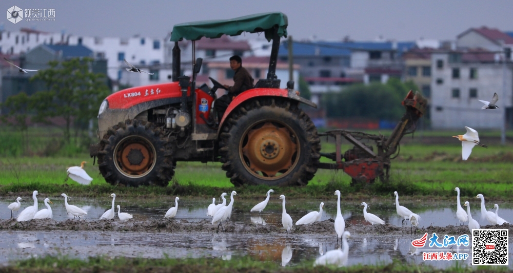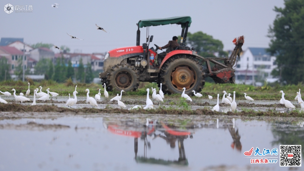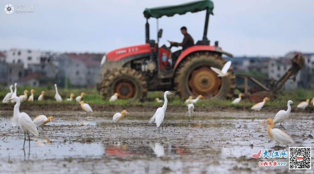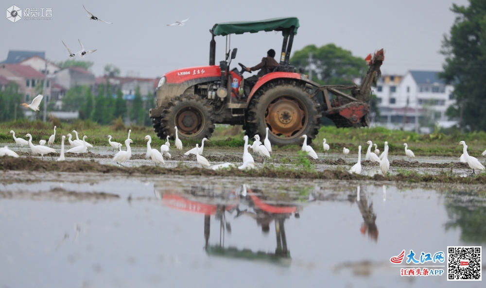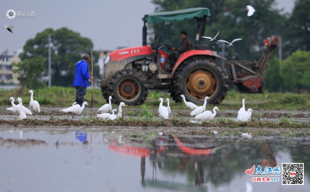 2020年4月22日,在江西省吉安市泰和县苑前镇颜家村,农民正在翻耕农田,成群白鹭嬉戏觅食,和谐共处,相映成趣,宛如一幅美丽的生态画卷。