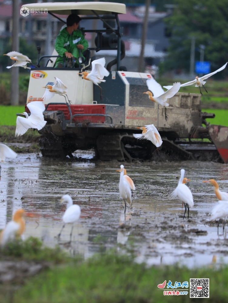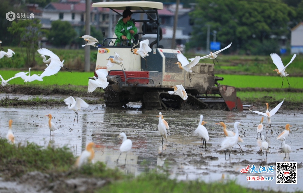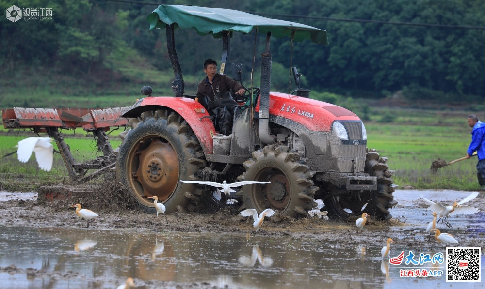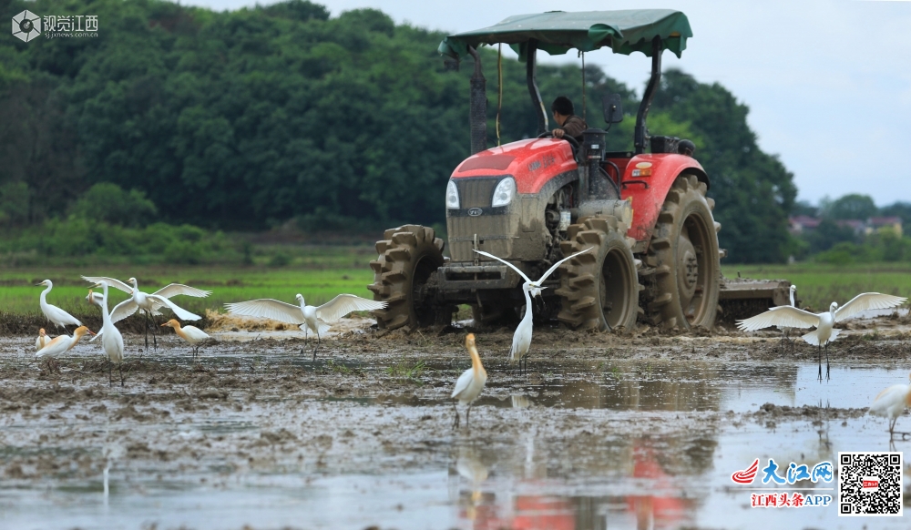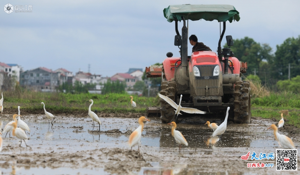 2020年4月22日,在江西省吉安市泰和县苑前镇颜家村,农民正在翻耕农田,成群白鹭嬉戏觅食,和谐共处,相映成趣,宛如一幅美丽的生态画卷。