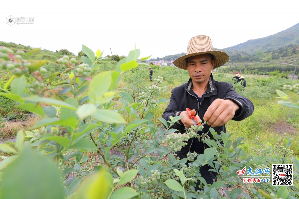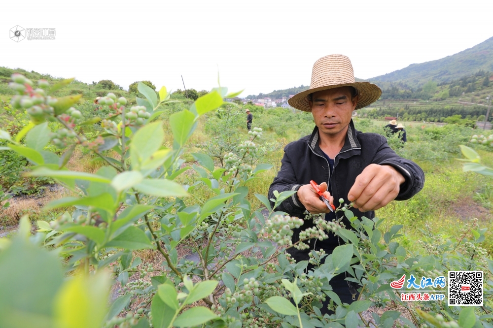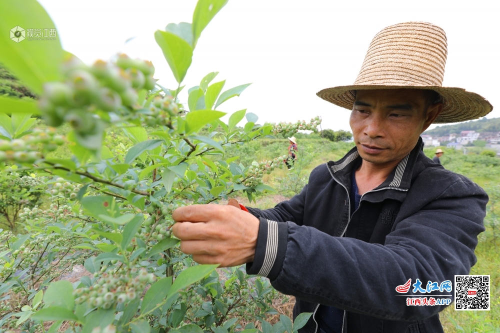 4月24日,走进江西省莲花县南岭乡四桂村蓝莓基地,一株株蓝莓树亭亭玉立,已结上了星星点点的泛青果实,长势喜人,贫困户刘金立与几个村民正忙着疏果,提升果实品质。近年来,莲花县大力扶持贫困村发展扶贫产业,引导贫困户通过入股合作社、参与管护获取收入,让生态水果成为脱贫致富果。