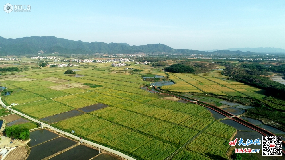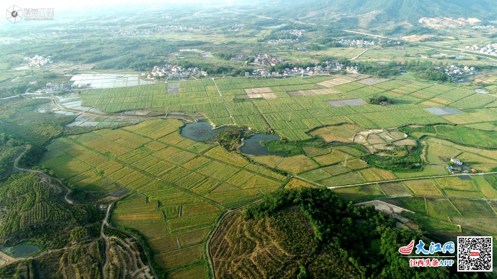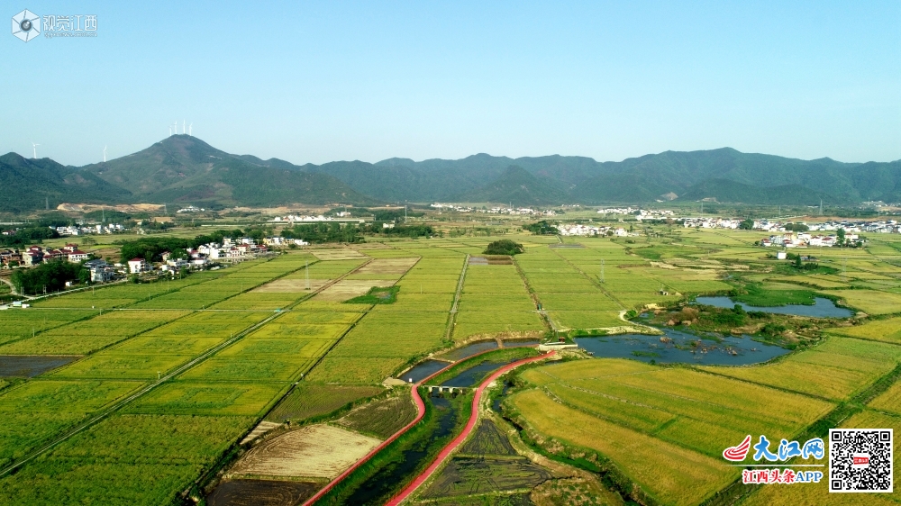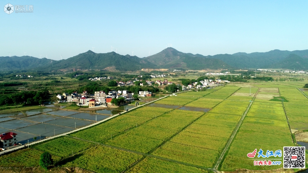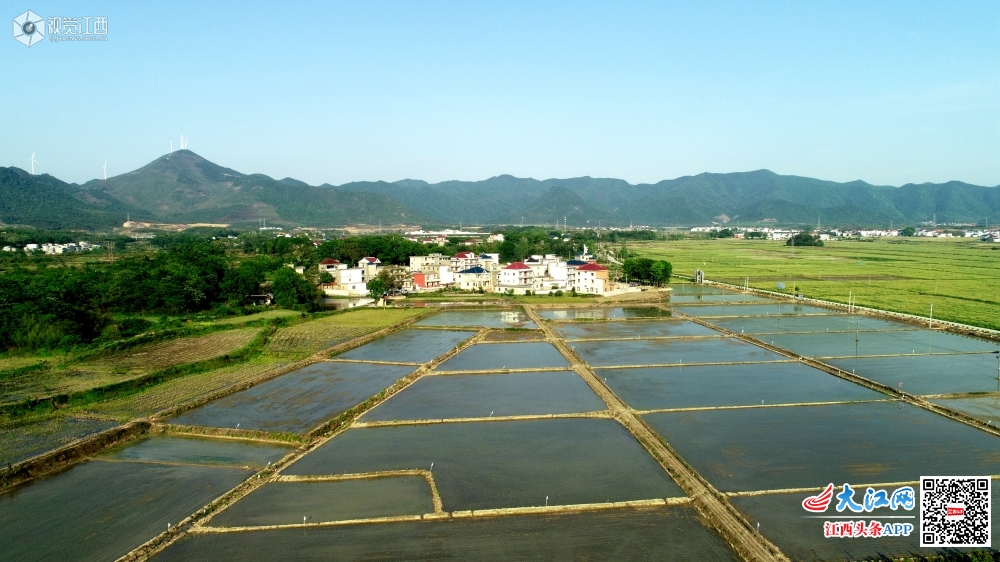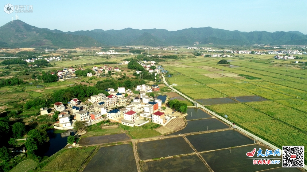 2020年4月26日,阳光下的江西省九江市湖口县武山镇武前村,屋舍俨然、畦畦油菜、青山含翠,远远望去,好似一幅优美的田园风景画。