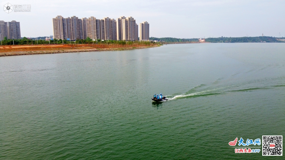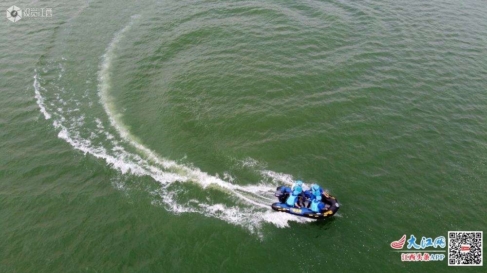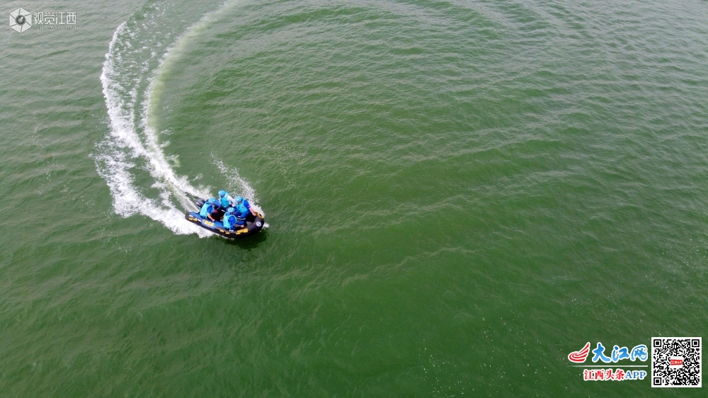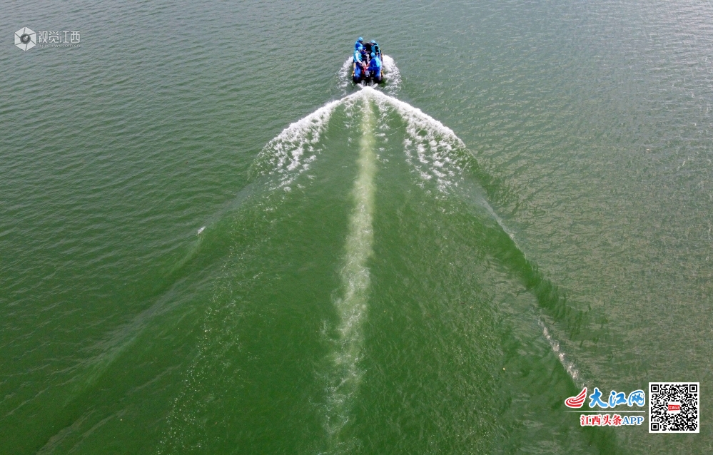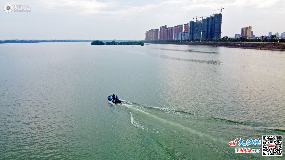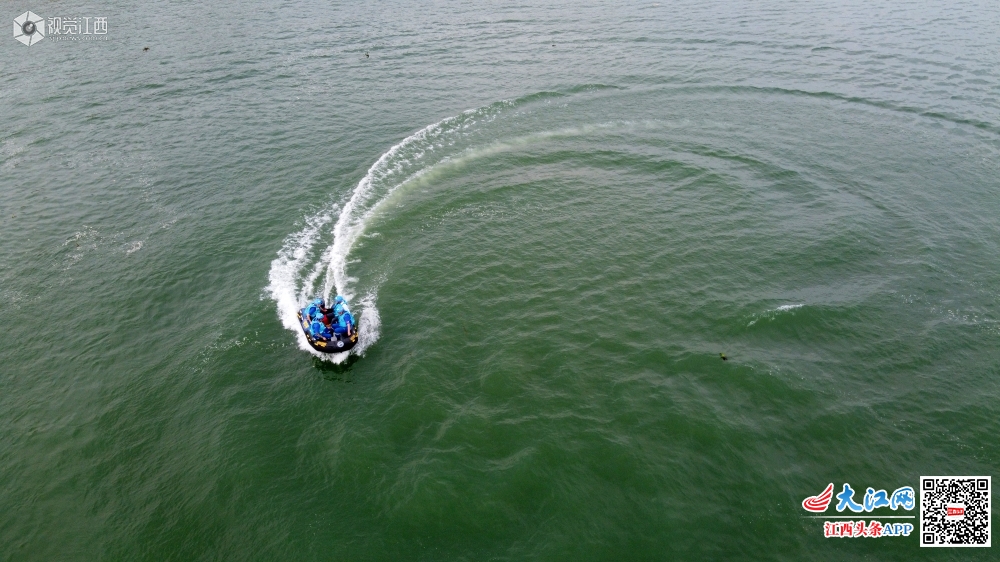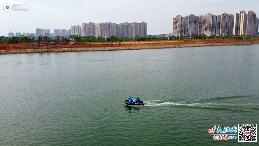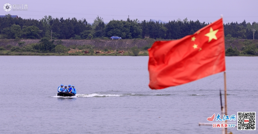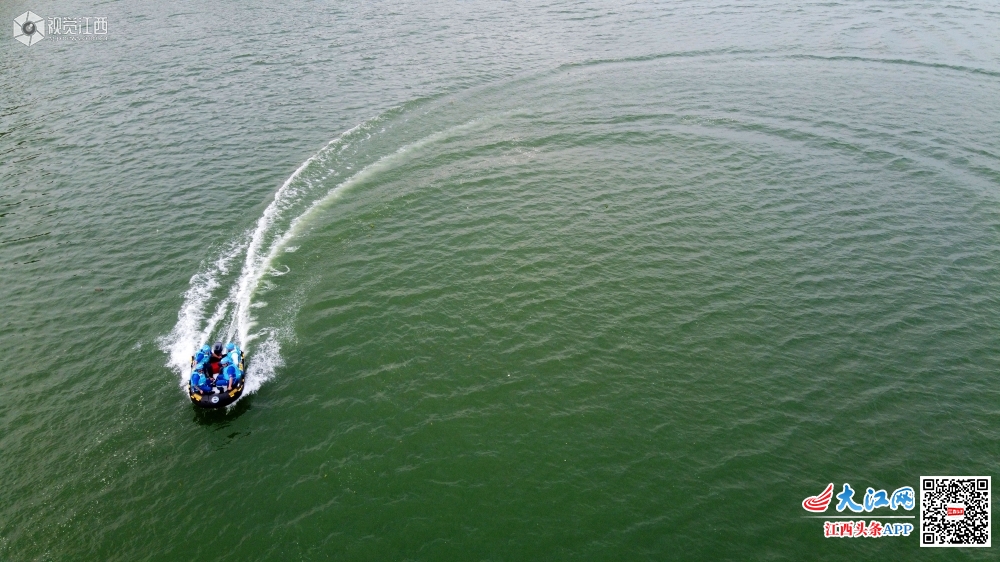 4月30日,江西省吉安市泰和县蓝天救援队志愿者们驾驶着冲锋艇在赣江中开展应急救援训练。