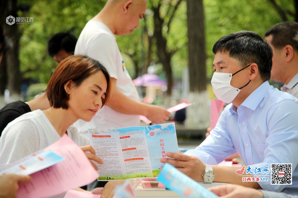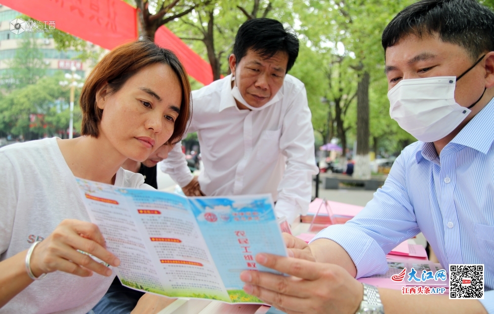 2020年5月1日,江西省吉安市峡江县司法局法律工作人员在向群众宣传农民工维权知识。