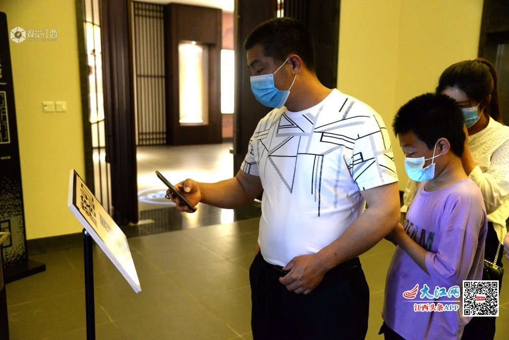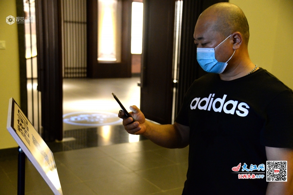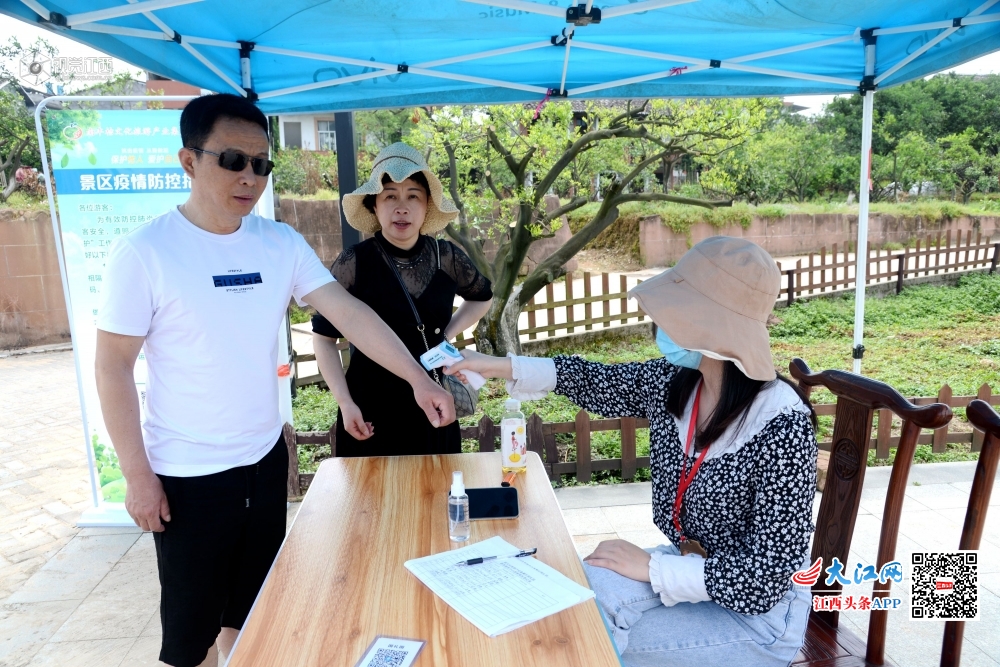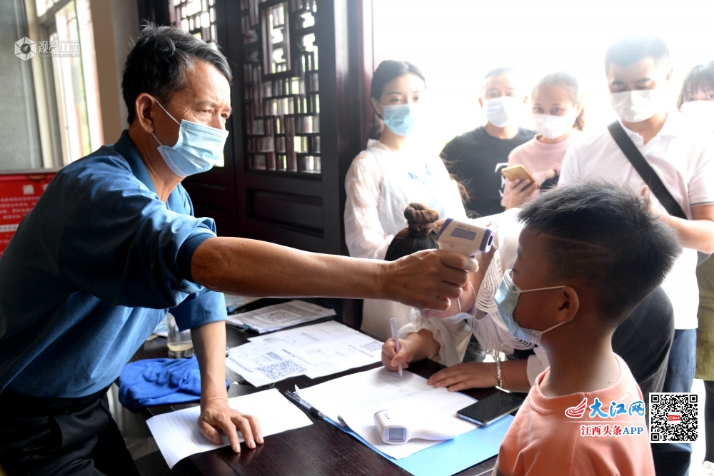 2020年5月3日,江西省南丰县国礼园、曾巩文化园景区内,游客积极配合工作人员做好包括测量体温、安全扫码等工作,确保“五一”假期旅游市场做到疫情防控和安全有序。
