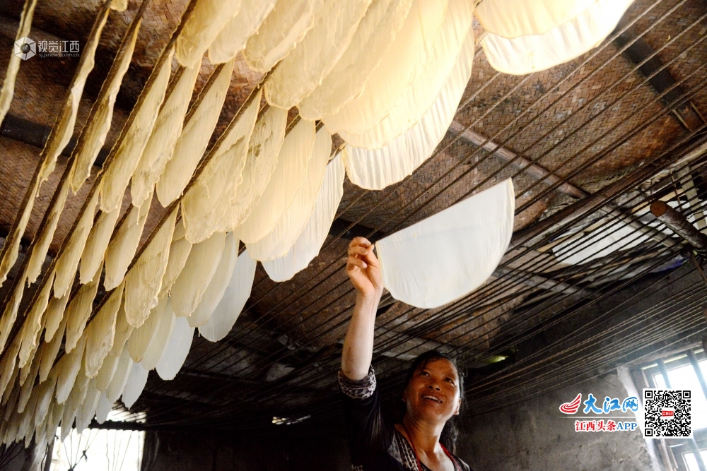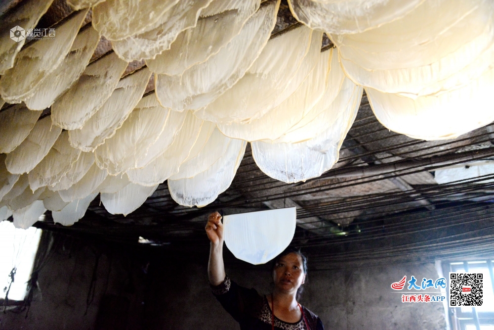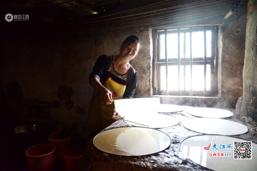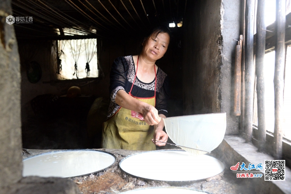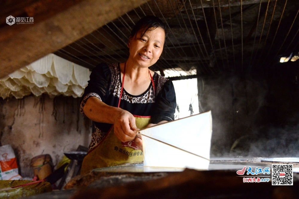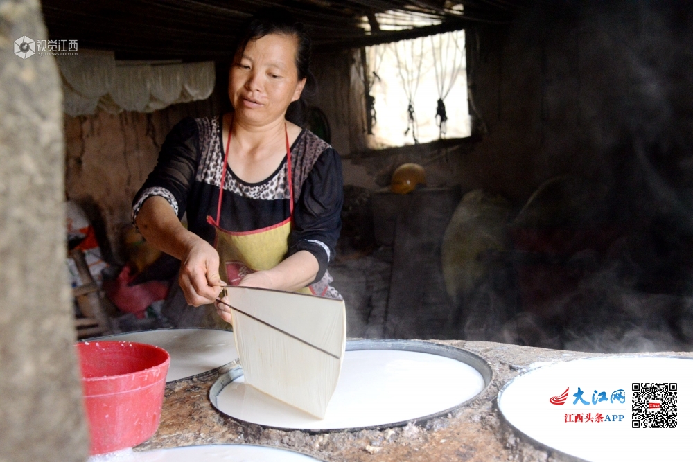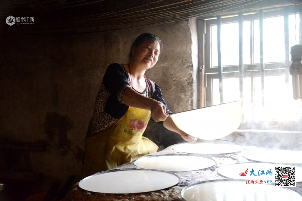 2020年5月4日,在江西省抚州市南丰县洽湾镇上店村前江村小组豆皮加工作坊里,村民江兰容正在从热气腾腾的锅中挑起豆皮。