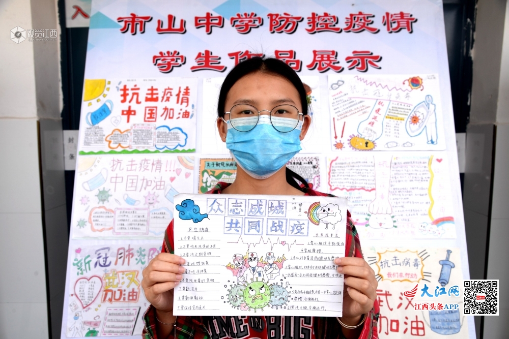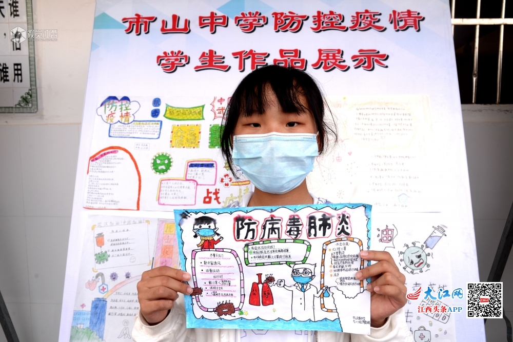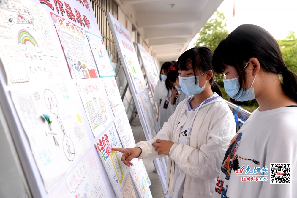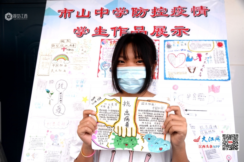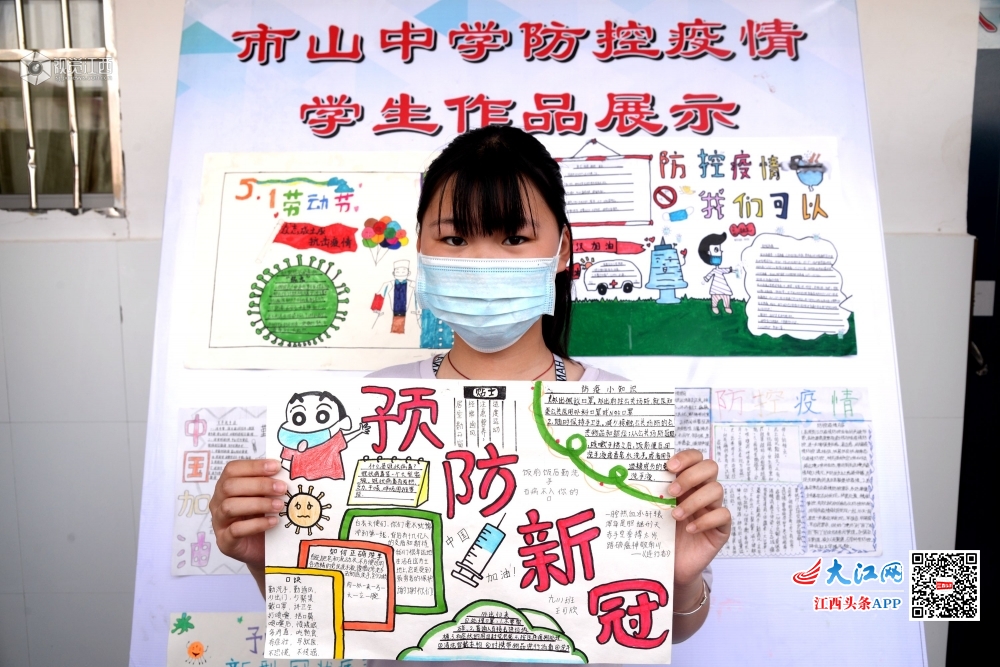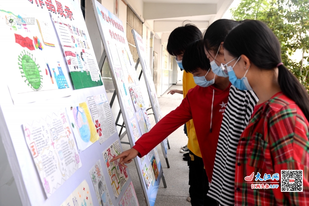2020年5月6日,江西省抚州市南丰县市山中学初三学生在学校制作的“市山中学防控疫情学生作品展示”展板前,学生在展示自己制作的作品,并且观看展板照片。