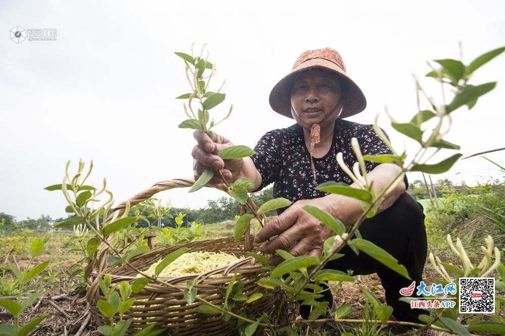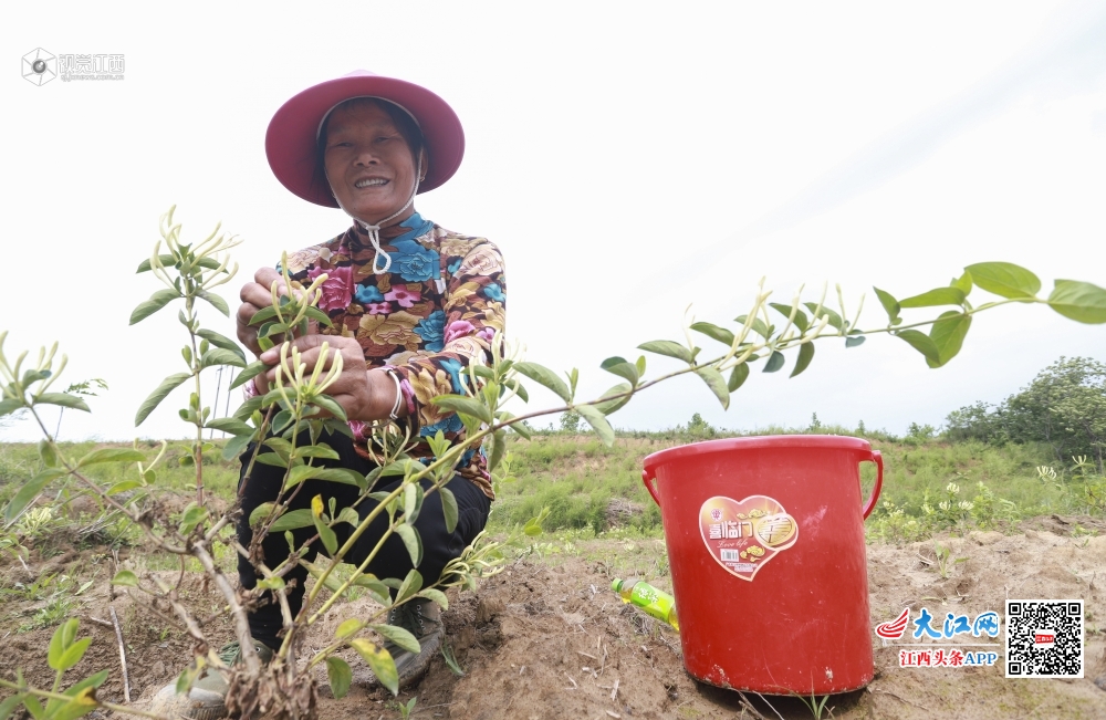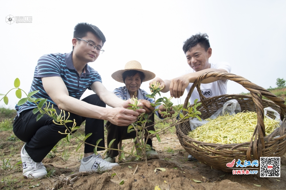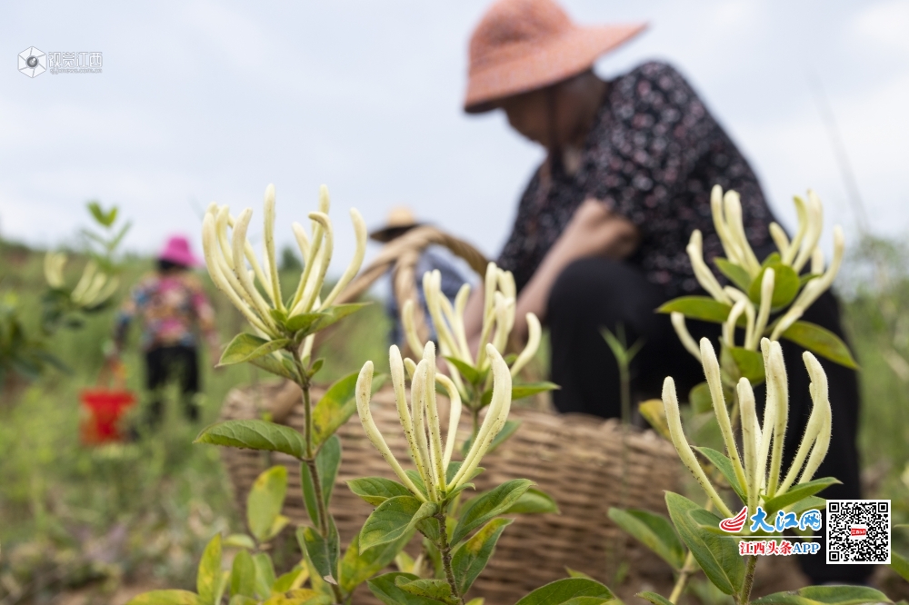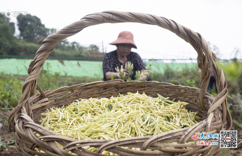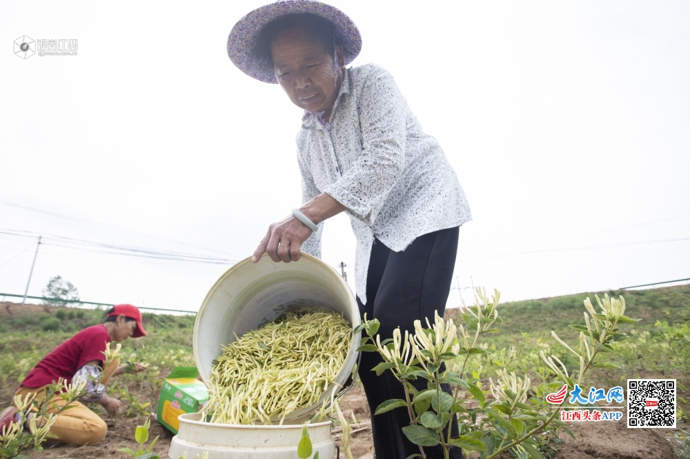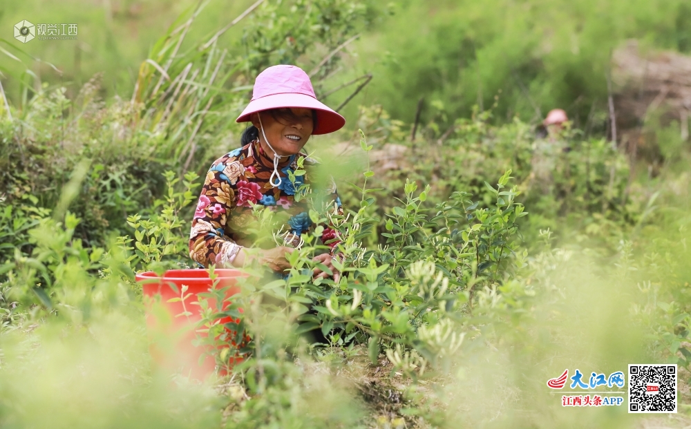 2020年5月8日,江西省九江市湖口县均桥镇文光村50余亩金银花花俏枝头,农户正在采收花骨朵。2019年至2020年,湖口县两年安排专项资金6000万元,对村级集体经济发展项目进行扶持,大力发展特色农业、品牌农业、智慧农业,形成“一乡一业”“一乡一园”“一村一品”现代农业新格局,带动村级集体经济发展壮大,助力脱贫攻坚。