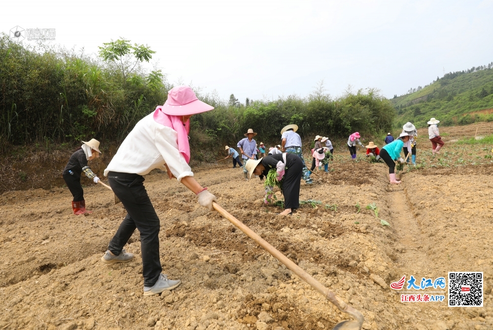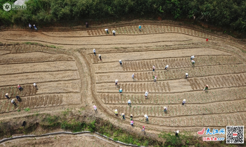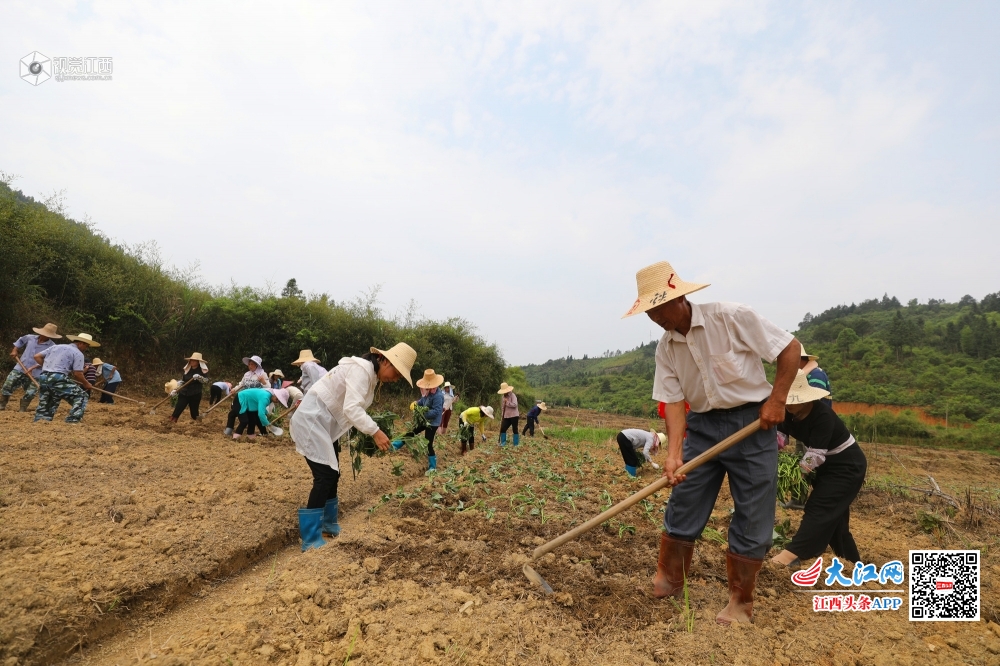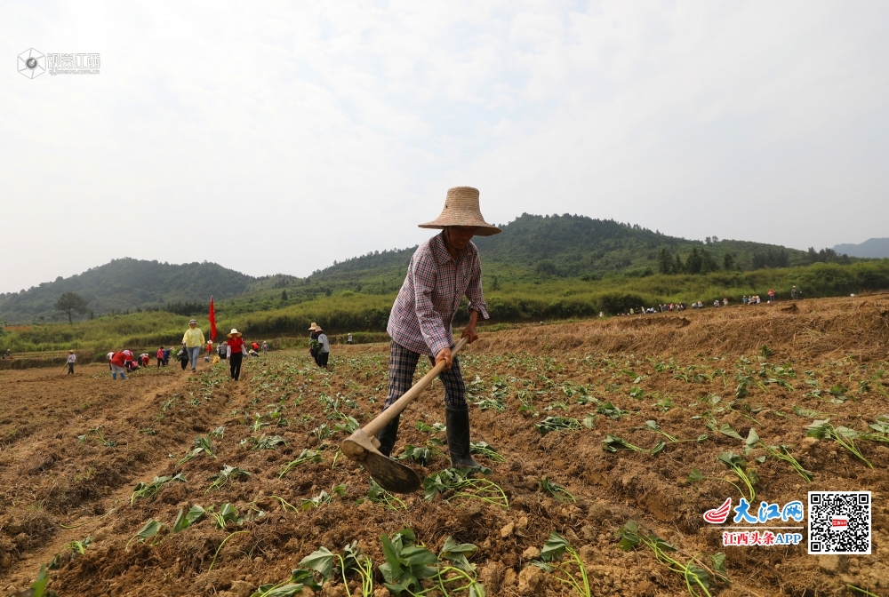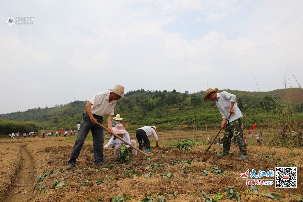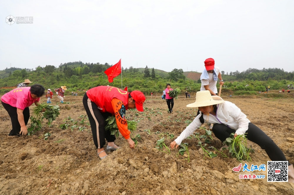 5月9日,在江西省莲花县坊楼镇沿背村扶贫产业基地,170多名党员干部、村民、志愿者和贫困户正在忙着栽种红薯苗,整地、挖坑、放苗、培土,现场一派忙碌的劳动场面。在驻村帮扶单位的帮助下,该村利用荒地种植高品质红薯新品种“红心蜜薯”15万株,村里有劳动能力的50多名贫困户通过参与田间管理能增收2000元左右。