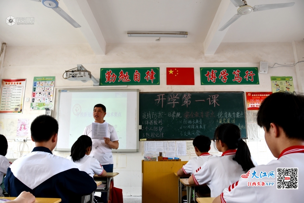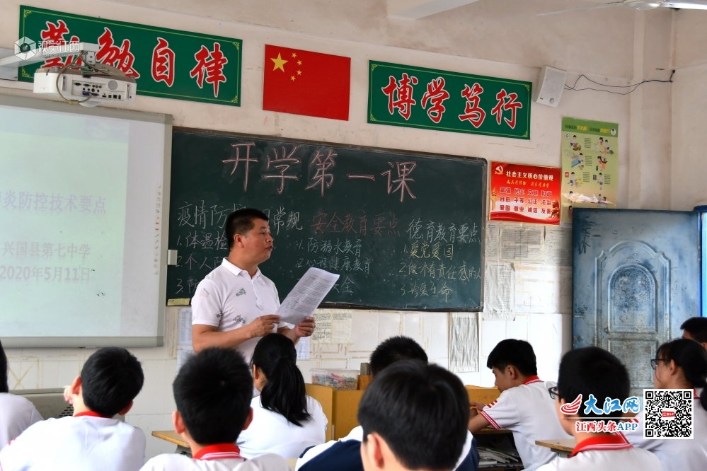 5月11日,江西省兴国县第七中学教师在给学生上“开学第一课”。在做好疫情防控工作的前提下,兴国县各学校以疫情为主题,把疫情防控知识、安全教育、爱国主义教育等融入“开学第一课”,让疫情之下的复学充满了别样的意义。