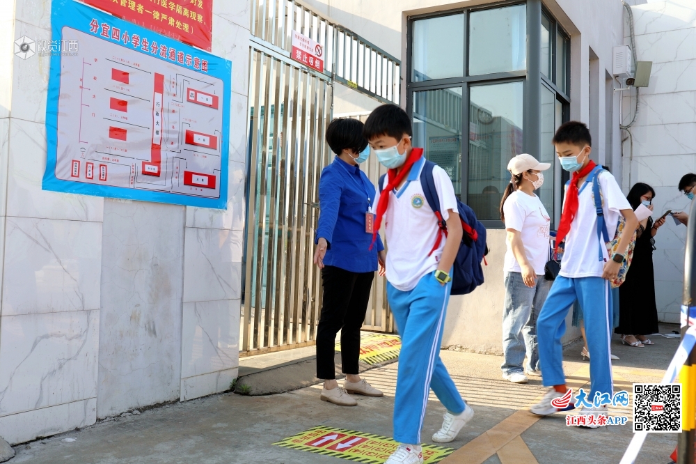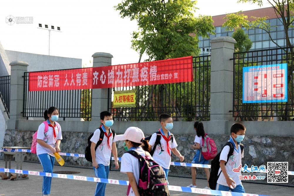 12日早晨 7时左右,分宜县第四小学门口就已经排起了“长龙”,同学们戴着口罩自觉保持间距,排队入校。每名学生进入校园前都要经过红外测温仪的测量,再根据指示牌进入班级。
