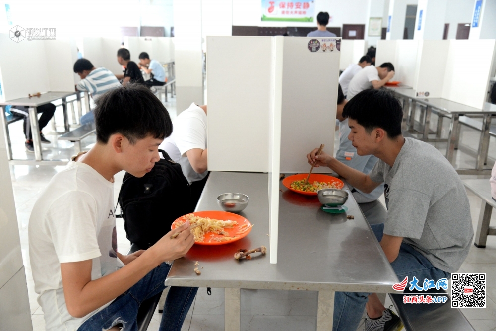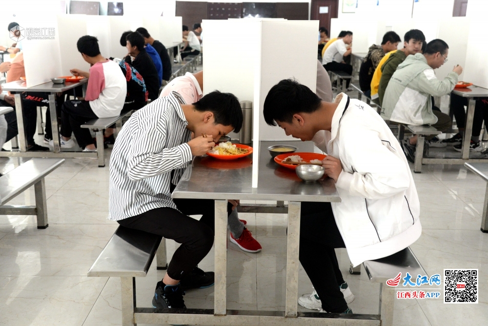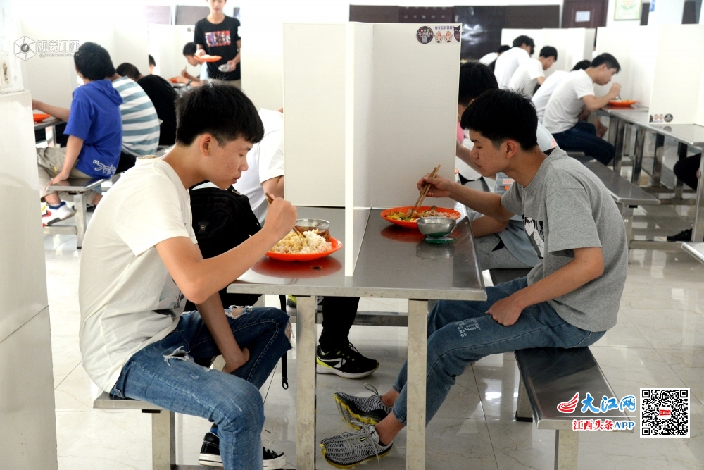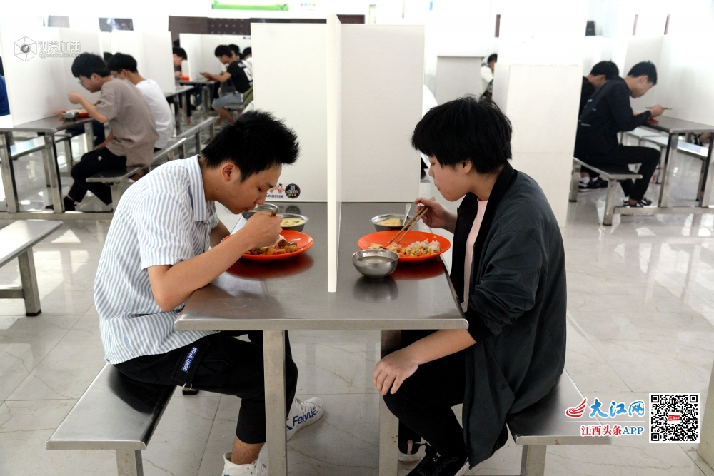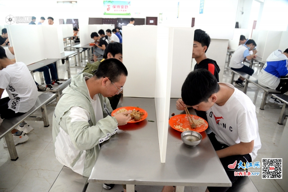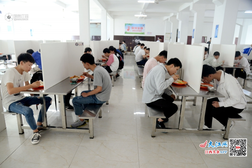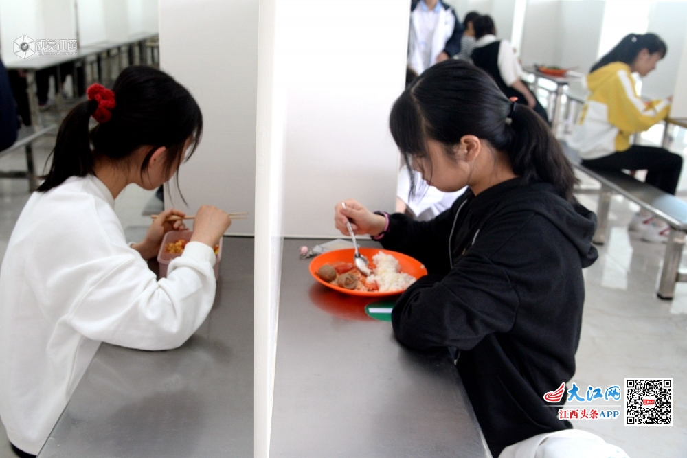 为保障学生的就餐安全,江西省南丰县第一中学采取有效措施,在食堂每张餐桌上均放置高过头顶的“十”字状隔板,学生就餐时一人一格,相互不接触。另外,该校实行学生分年级错峰就餐制,还在食堂安排了由校级领导带队的5名值班人员,负责分流和引导学生,确保学生就餐安全。