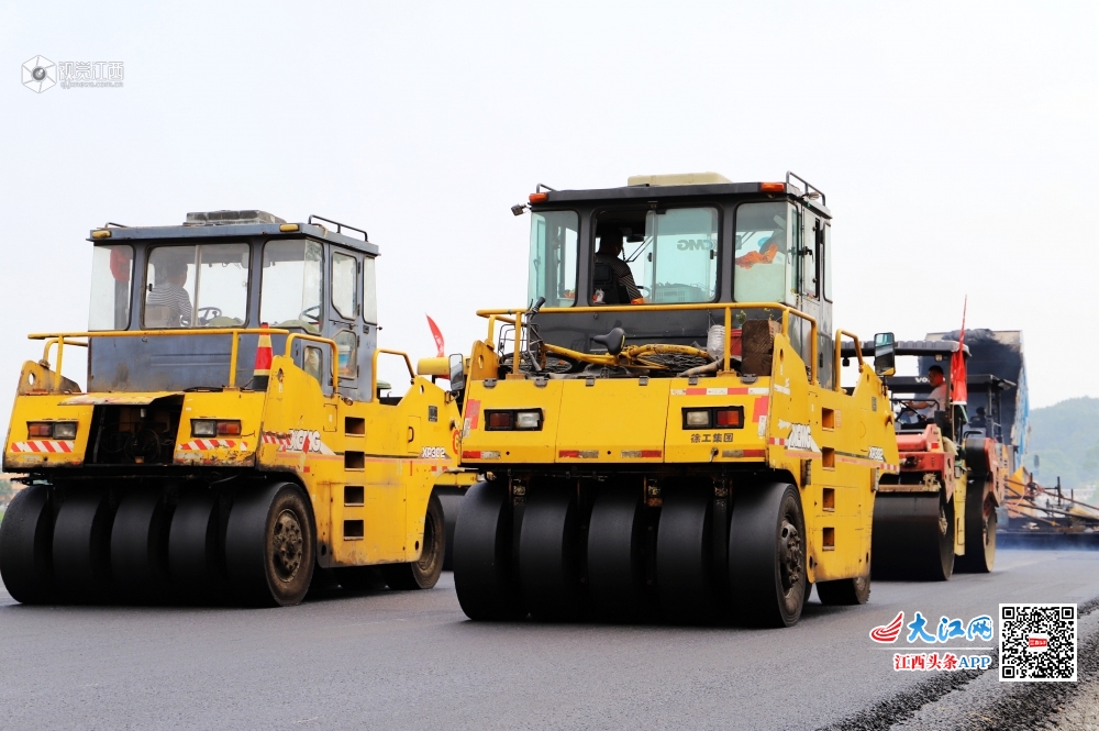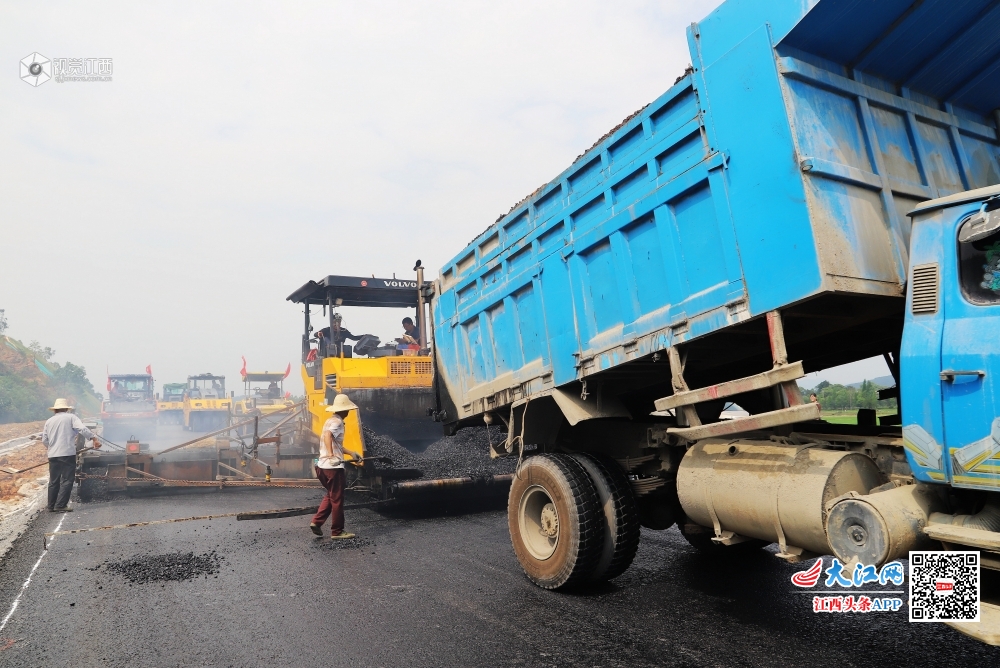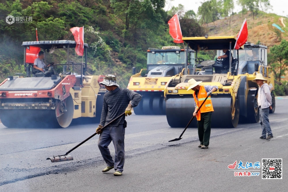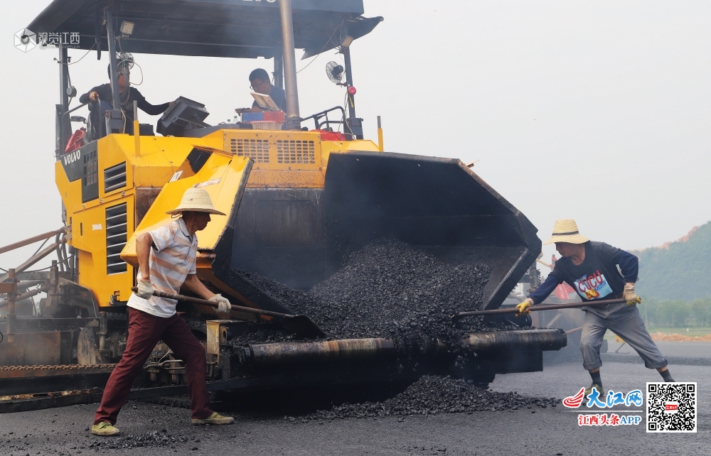 5月16日,安福县旅游快速通道枫田段工人在摊铺沥青路面。安福县旅游快速通道是江西省重点工程,东接大广高速安福站,西至安福武功山,全长84.43公里,总投资近20亿元。今年3月下旬复工以来,该工程指挥部科学安排工程进度,加强施工人员、机械设备和物资的管理组织,强化工程安全质量监管,锁定年内通车目标不动摇。
