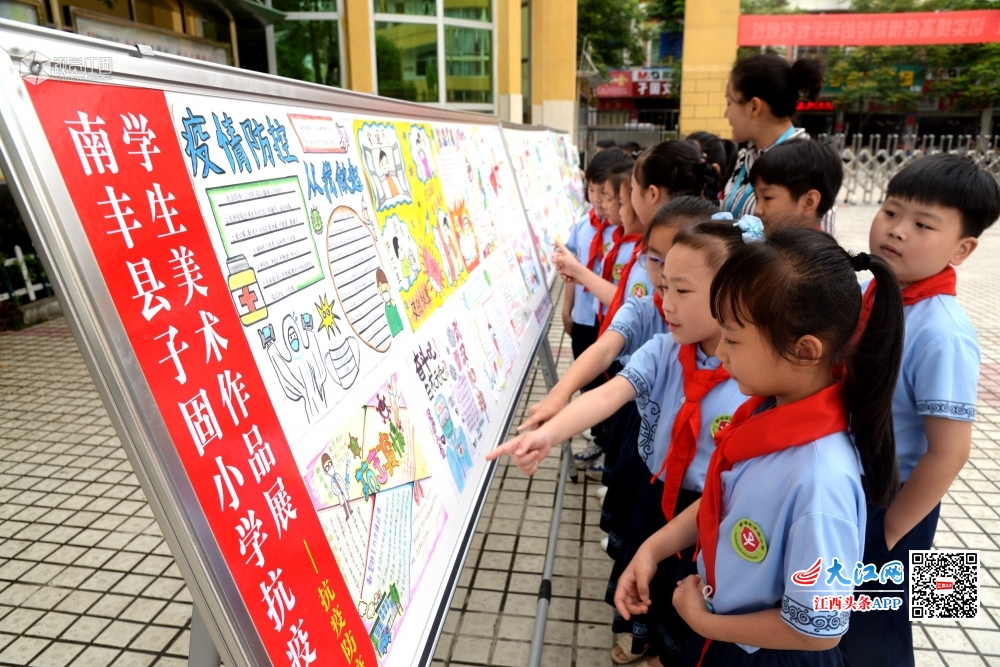 当天,是江西省南丰县小学一至三年级学生复学复课第一天。南丰县子固小学组织学生观看学校制作的“抗疫防疫学生美术作品展”,提高学生的防控疫情能力。