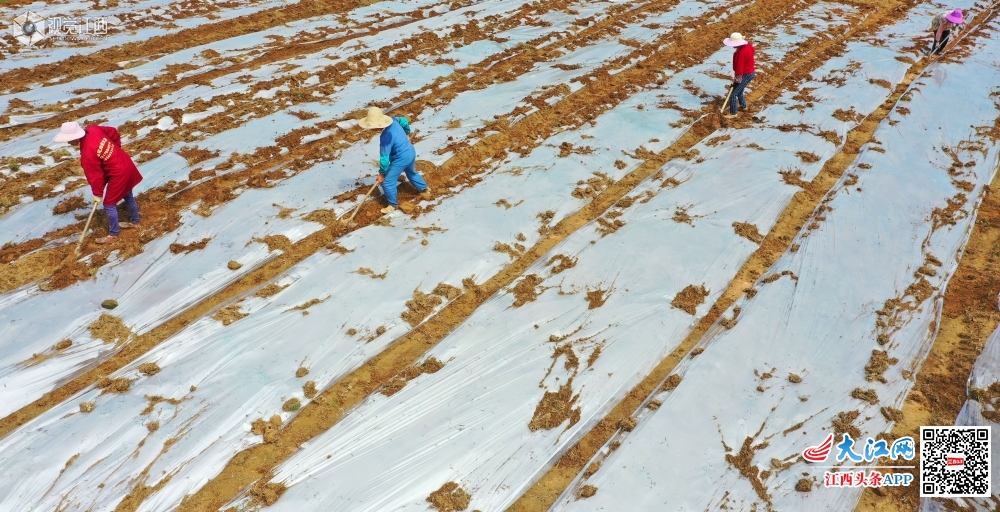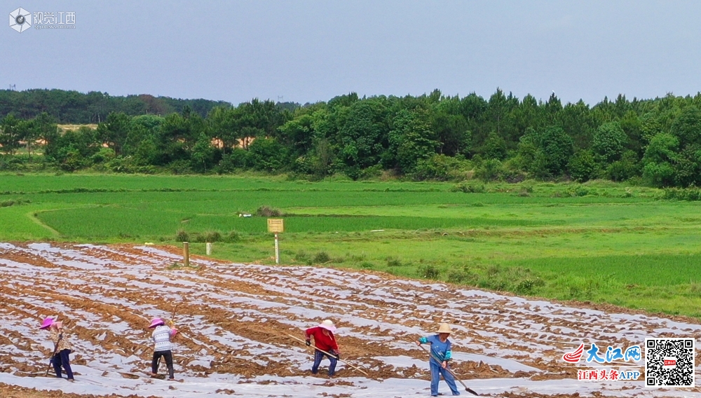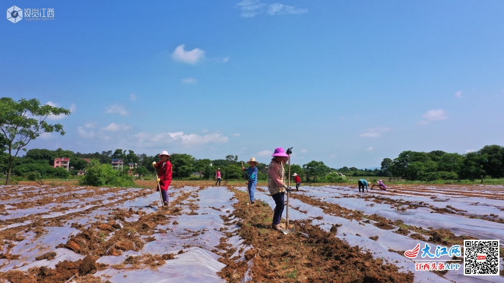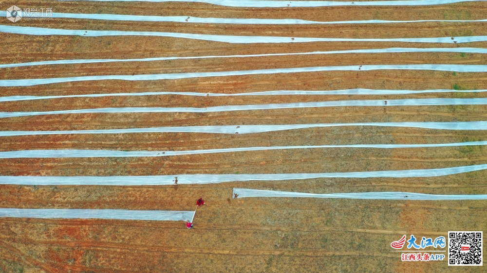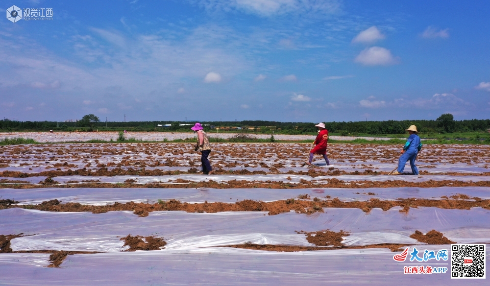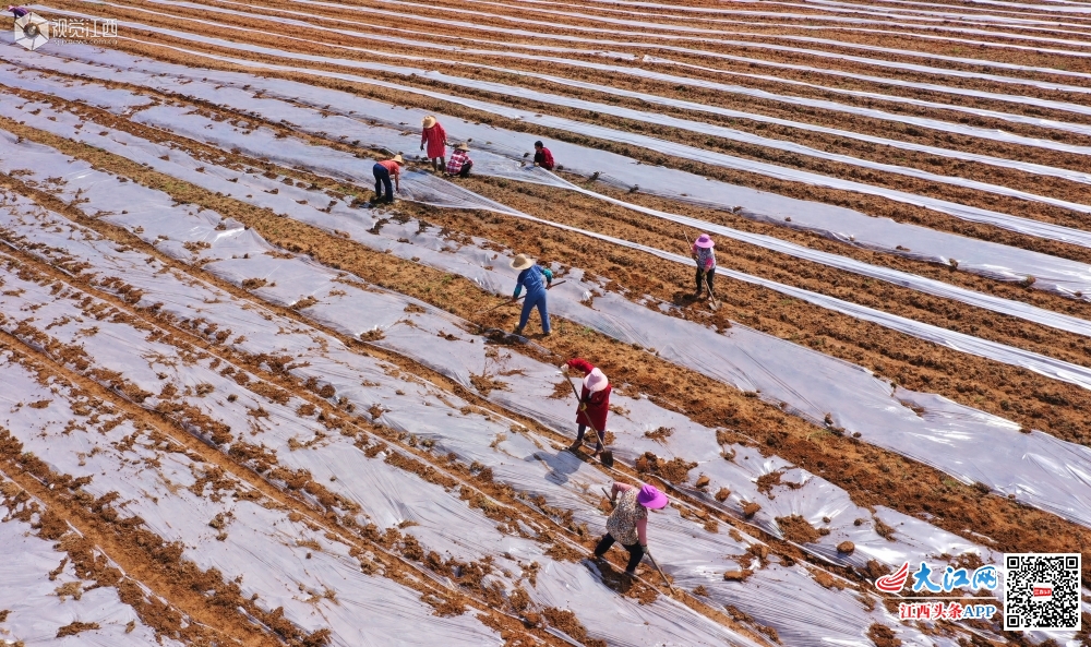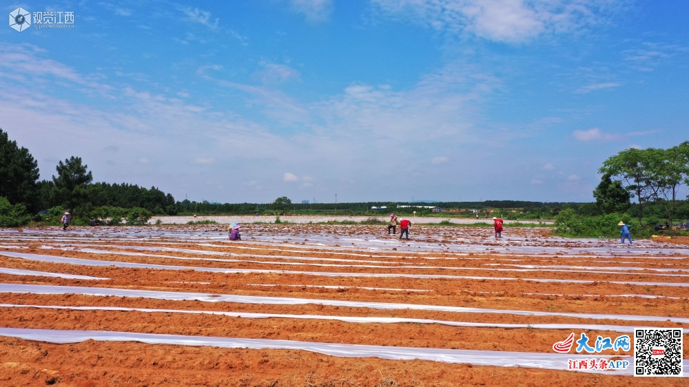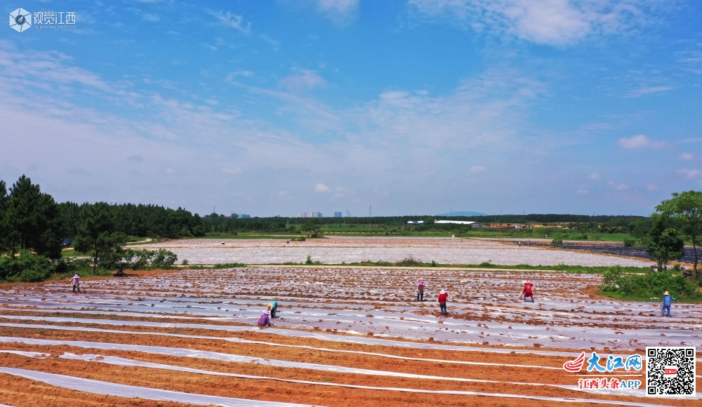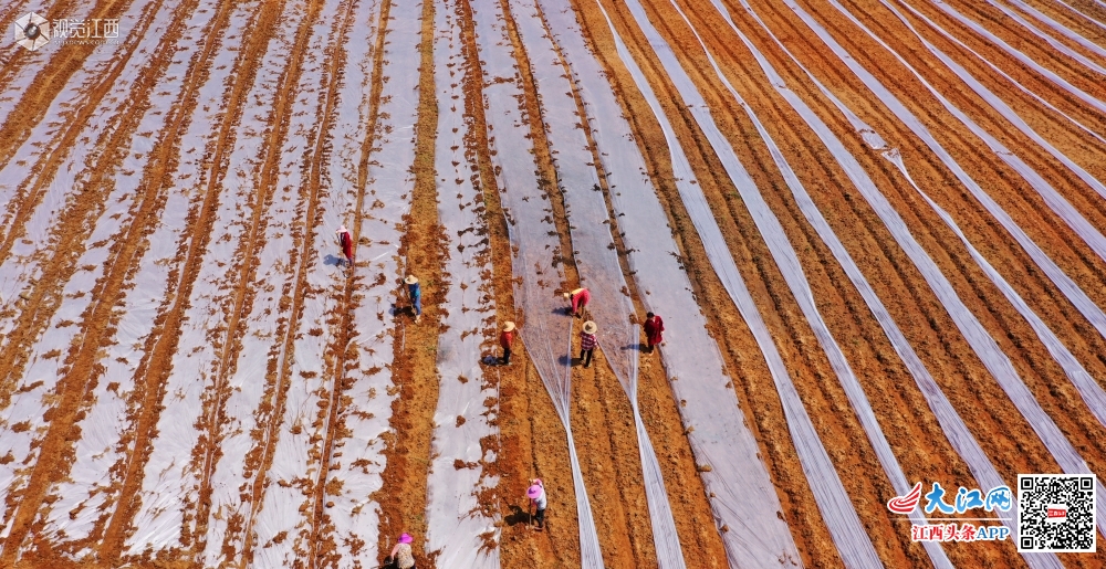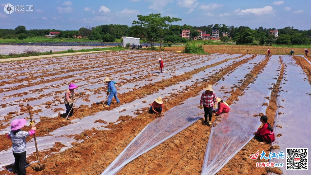 5月18日,在江西省吉安市泰和县沿溪峰达家庭农场种植基地,贫困群众正在进行覆盖薄膜劳作,准备播种西瓜,田间地头一派繁忙景象。