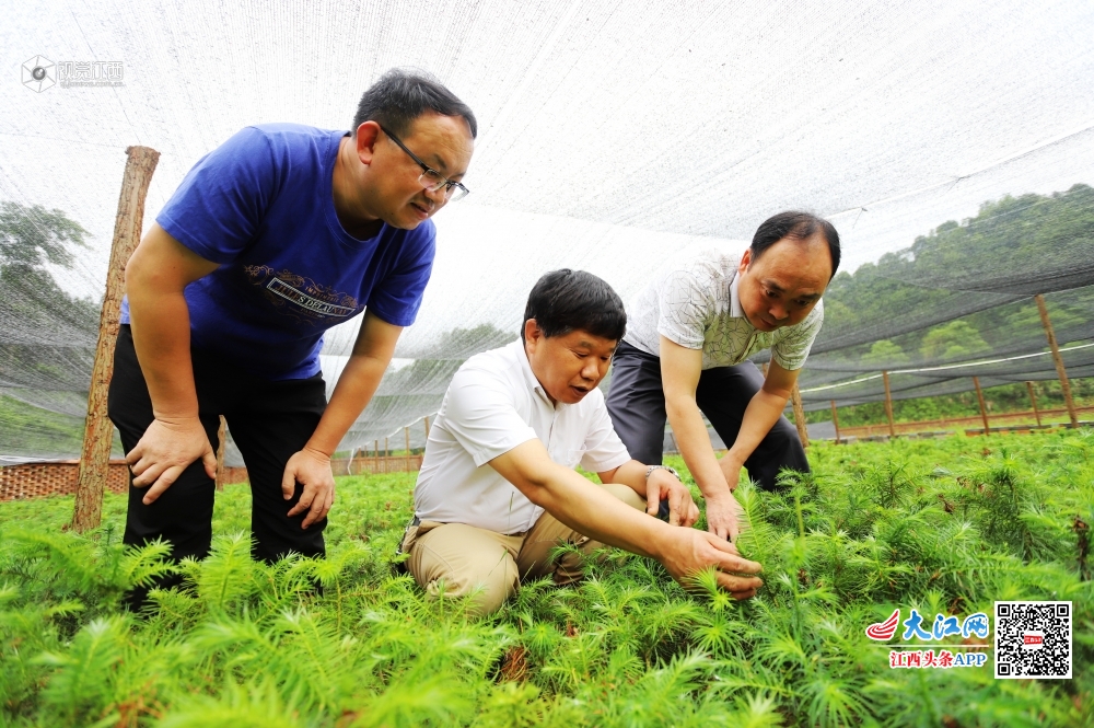 5月29日,江西省安福县陈山林场技术员在观察陈山红心杉苗生长情况。陈山红心杉及其产品是国家地理标志保护产品,陈山红心杉育苗已列为安福县八大扶贫产业之一。