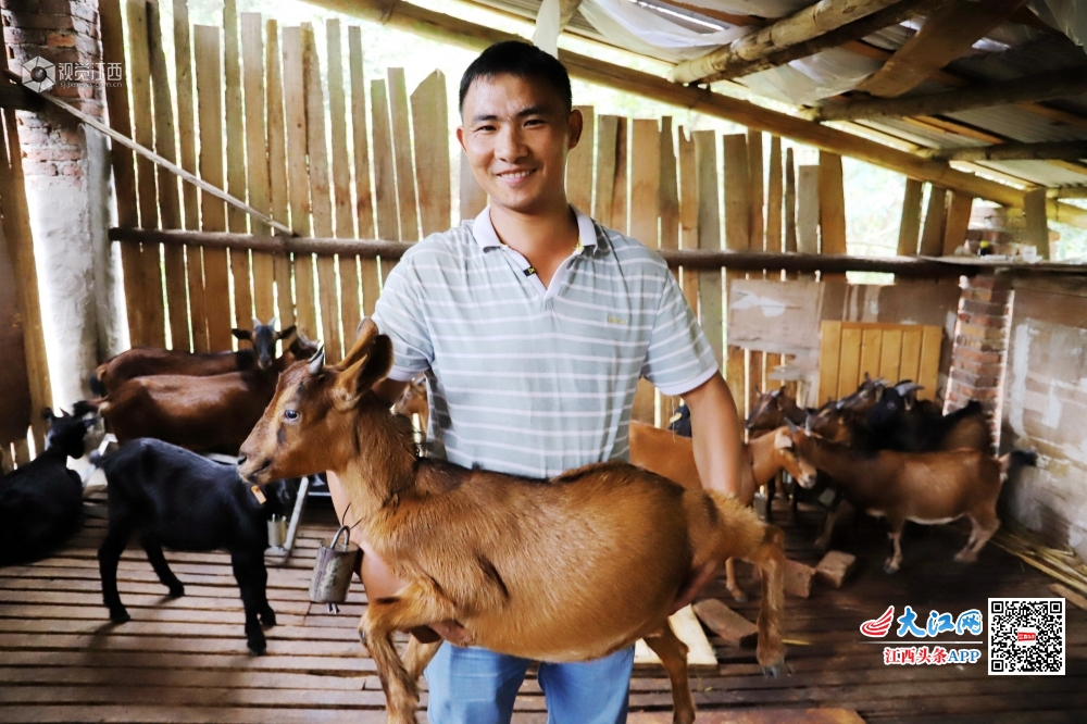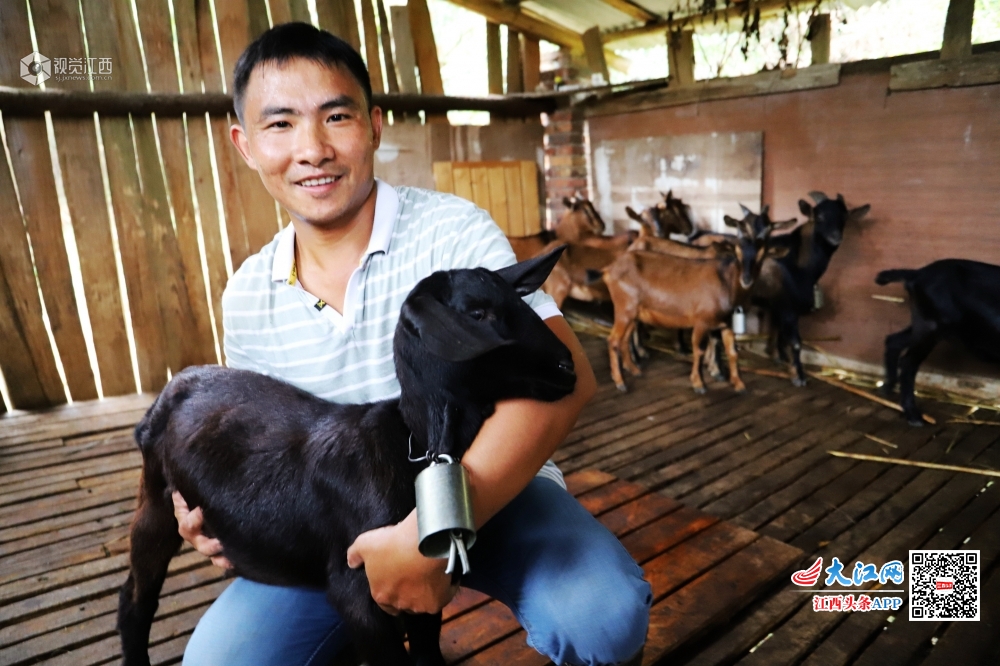 5月25日,江西省安福县彭坊乡洋陂村村民段文林和他的山羊合影。2016年,段文林从广东返乡创办家庭农场,年出笼山羊200余头、鸡2200余只,并带动当地贫困户养殖家禽家畜脱贫。