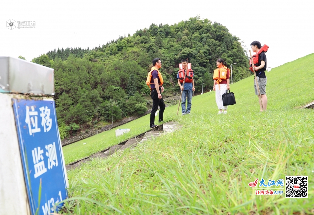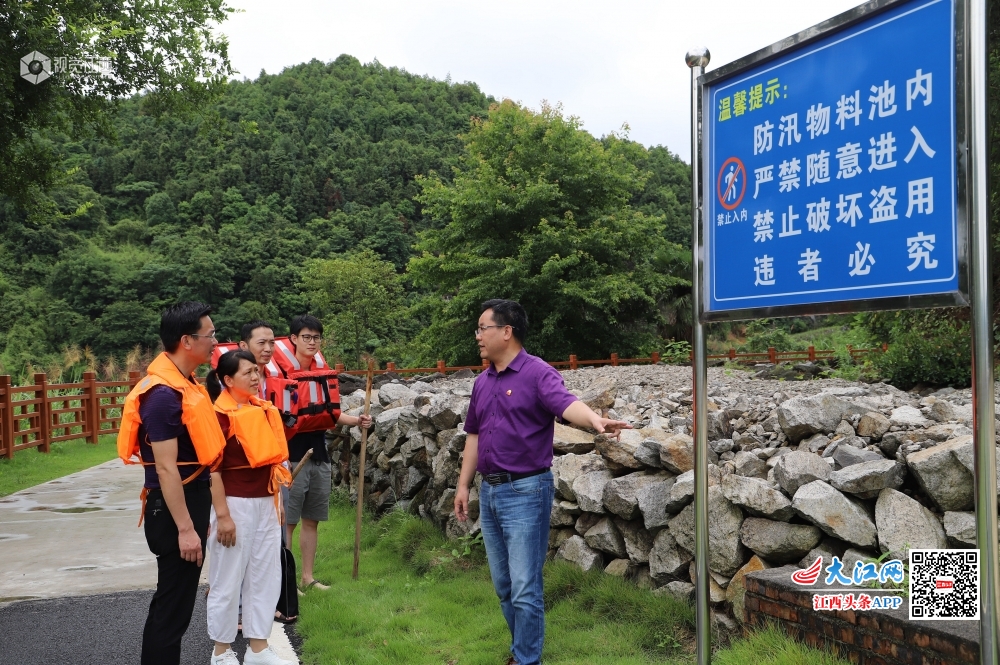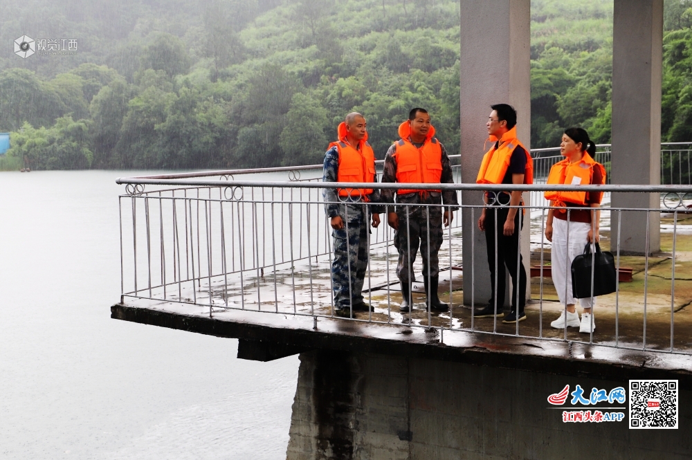 6月5日,江西省安福县纪委监委干部在严田镇岩头陂水库督查防汛工作。