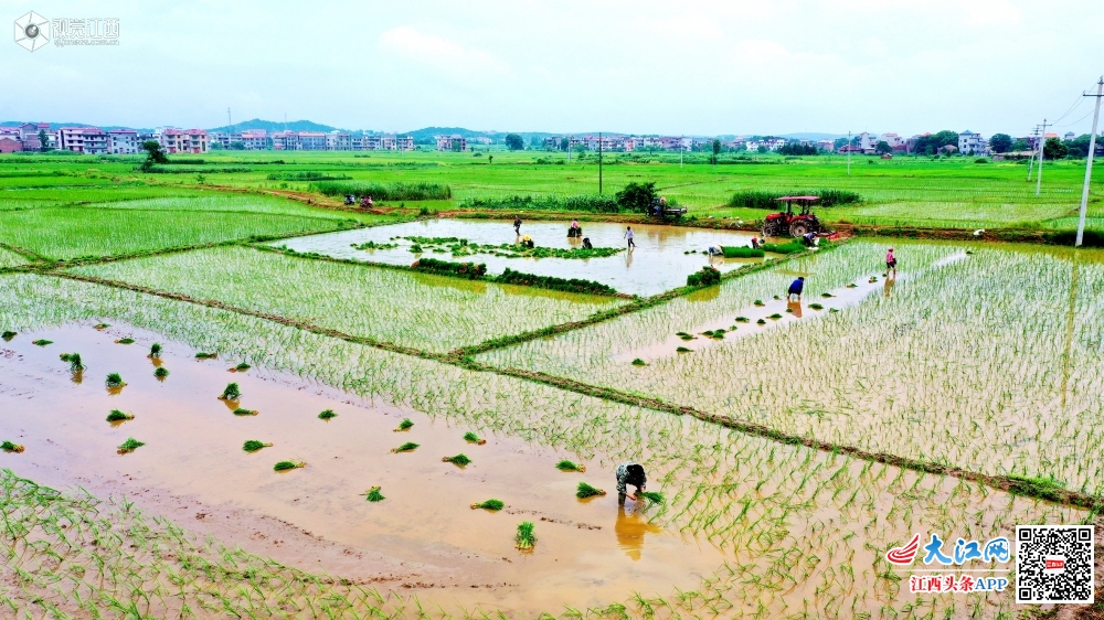 2020年6月9日,江西省吉安市吉水县阜田镇高家村,微微细雨中,村民们正冒雨栽种中稻。