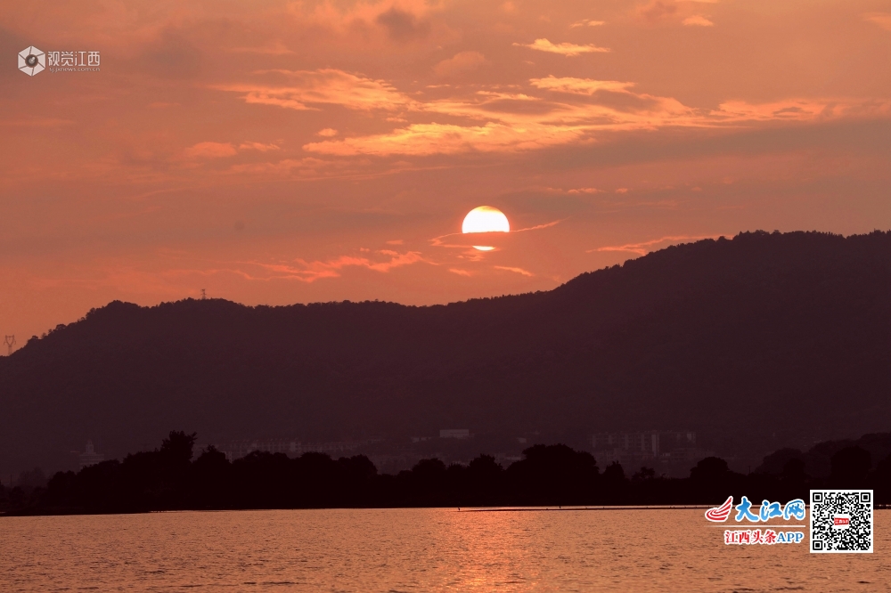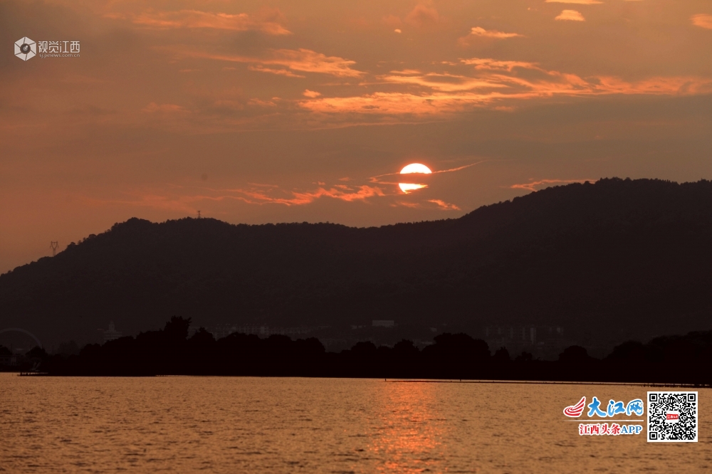 6月10日,江西省分宜县钤阳湖夕阳美如画。落日时分,钤阳湖湖面风平浪静,夕阳在云层里快速穿行,不时将天空和湖水披上多彩的光环,让人流连忘返。