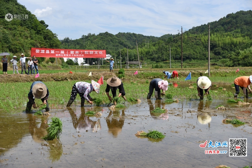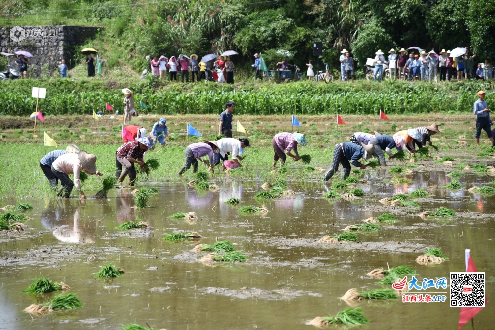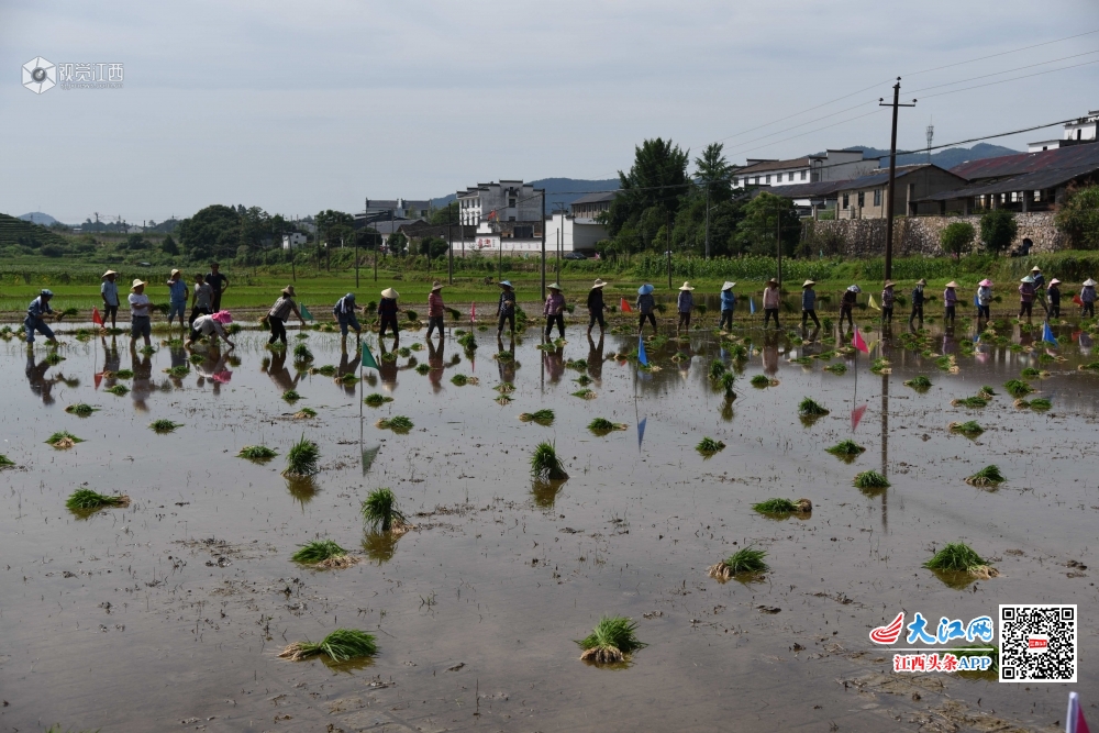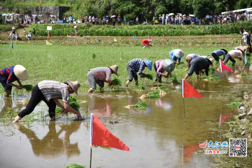 6月13日,婺源县赋春镇盘坑村惠农农产品专业合作社举办插秧大赛,50多名选手在同一块水田中比赛谁插得又快又好,观赛村民在田边为选手加油助威,展示了当地农民娴熟的农业技巧,丰富了他们的业余生活。