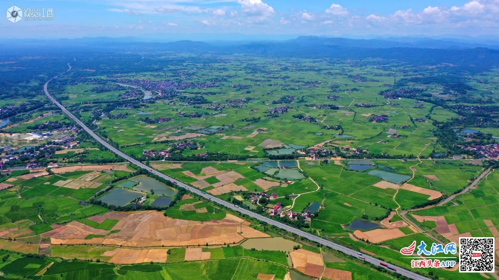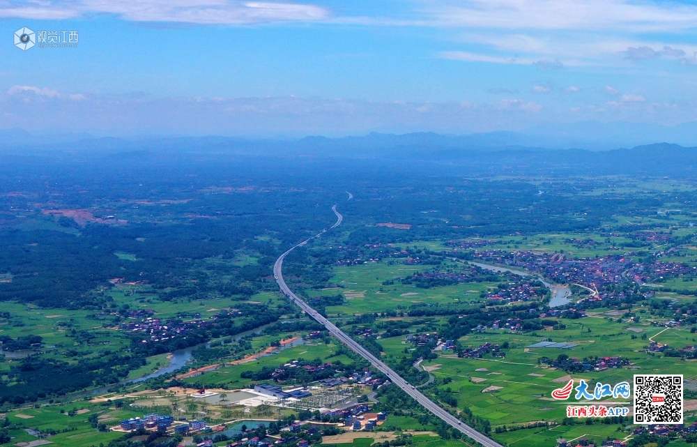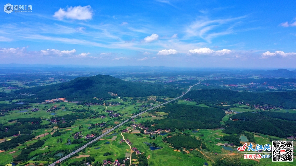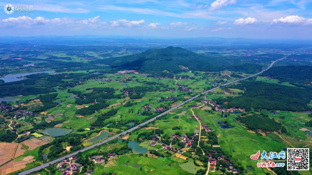 6月16日,在江西省泰和县马市镇,大广高速公路犹如巨龙,穿越阡陌田园,与稻田、村庄相映成趣,构成一幅美不胜收的夏日田园画卷。近年来,泰和县在推进脱贫攻坚工作中,积极发展立体交通,形成了井冈山机场、赣江航运、昌赣高铁、京九铁路、大广高速等为框架的现代化交通区位优势,助力脱贫攻坚。