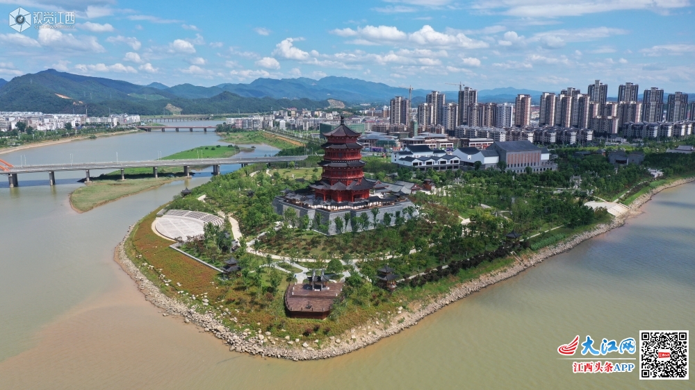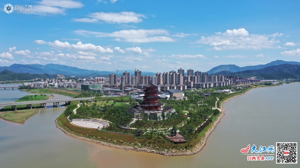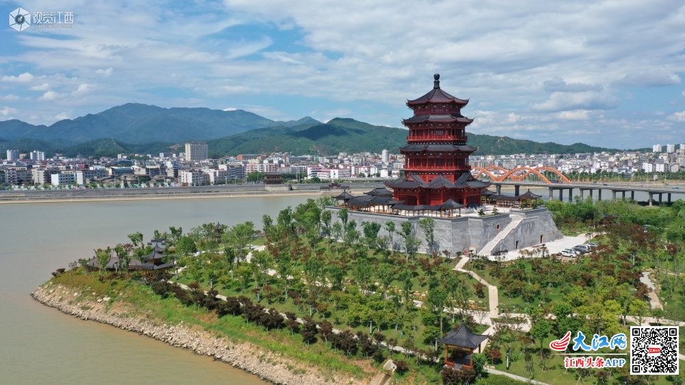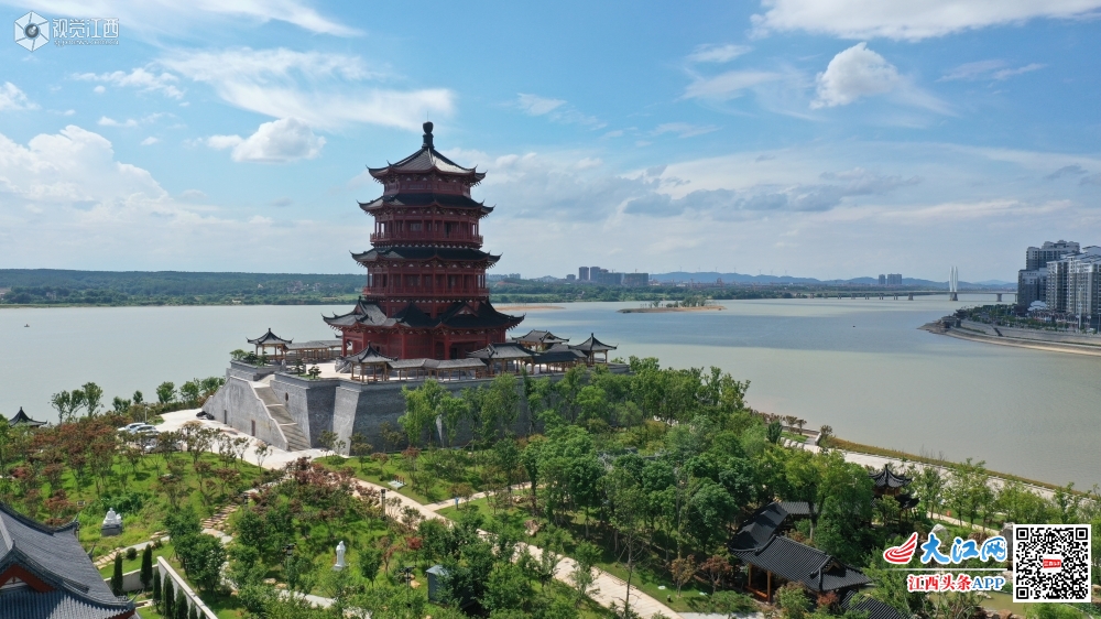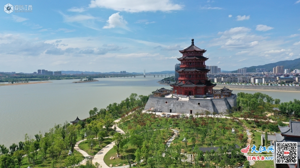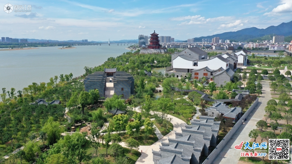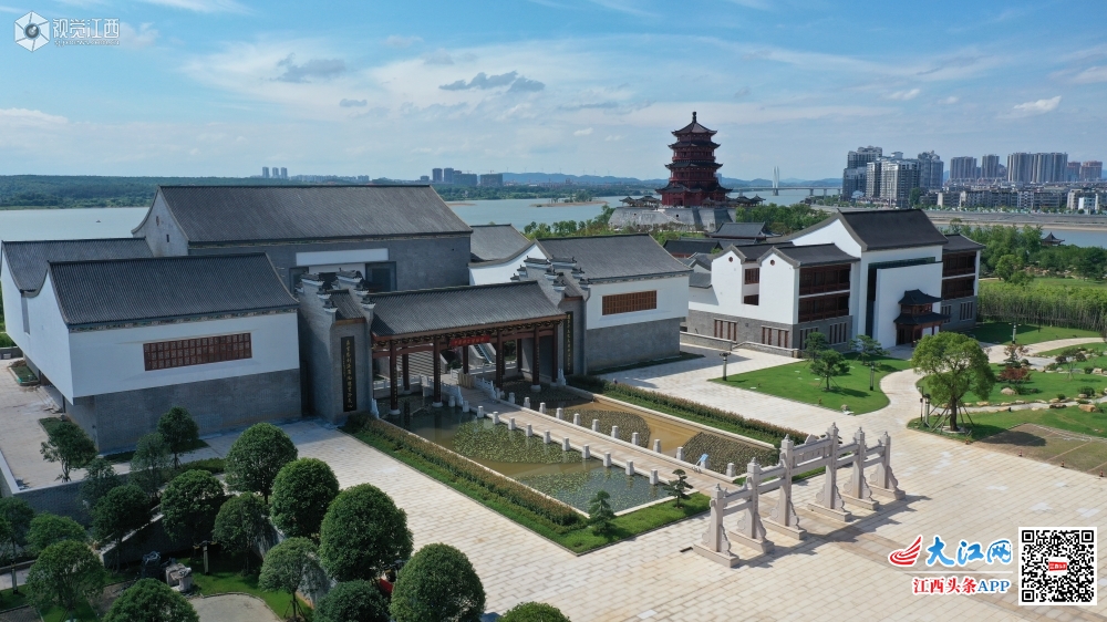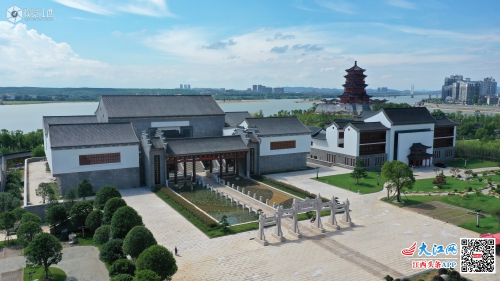 2020年6月15日,空中俯瞰江西省吉安市吉水县中国进士文化园依江而建,楼亭阁榭,绿树掩映,蓝天白云下,蔚为壮观。江西省吉安市吉水县中国进士文化园结合庐陵文化特色而建,整个空间布局以进士博物馆为核心,结合藏书楼、官署、文庙、状元门、状元阁、状元府第、戏楼、进士旗杆广场、亭台廊轩、古桥、古码头等元素,结合现代化技术,通过情景再现的方式,让游客感受庐陵文化的独特魅力。该馆按照国家一级博物馆的标准进行建设和陈展,是一座以科举进士文化为主要内容的专题性博物馆,布展面积超过一万平方米,设有进士与中国历史、江西科举进士文化、外国科举与进士文化、科举的现代影响等多个专业展厅,详细介绍我国古代1300年科举进程中进士文化的起源、发展和变迁。参观者可以在馆中系统地了解中国古代进士科举历程、科举考试程序,还可以看到历代进士大观、鼎甲进士概览等。