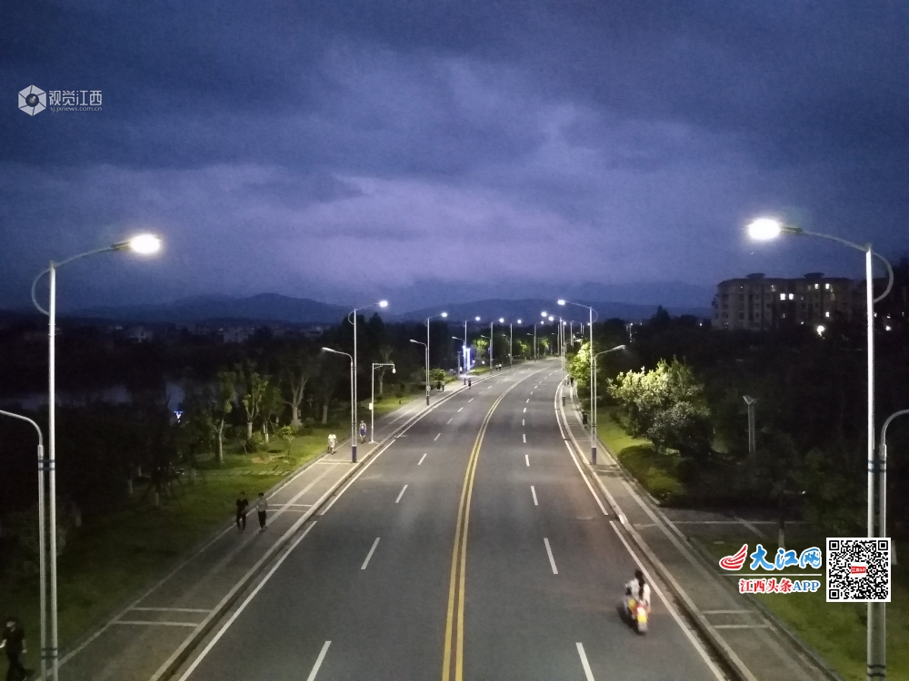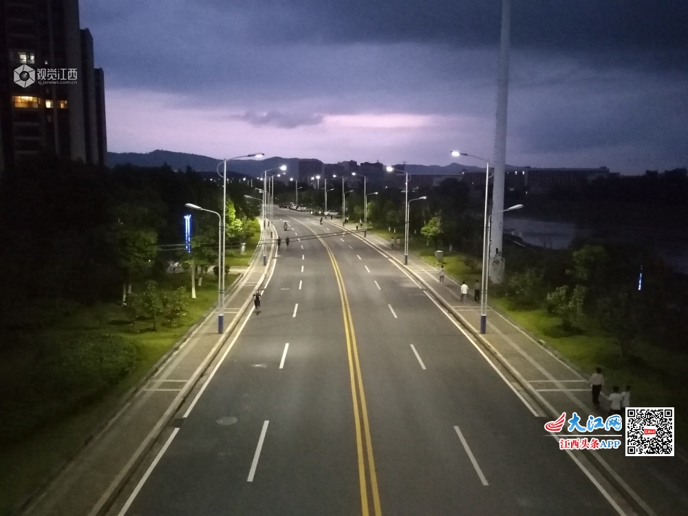 6月18日,江西省永新县夜幕下的禾水河畔微风轻拂,空气格外清新。吃过晚饭的永新市民在这绿草如茵的河堤边散步,享受着大自然给予的清幽和宁静。