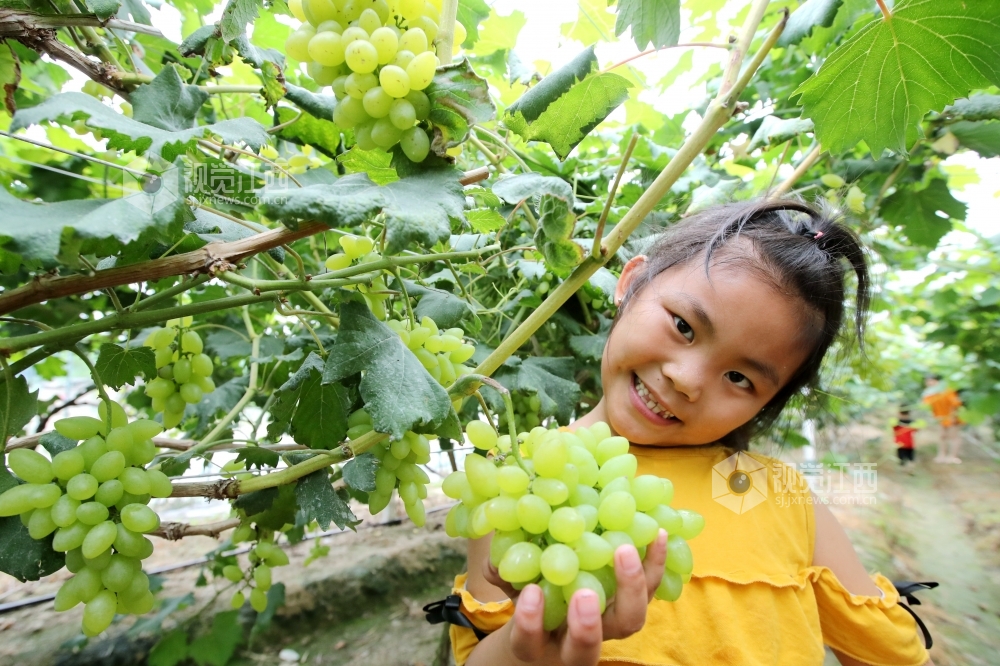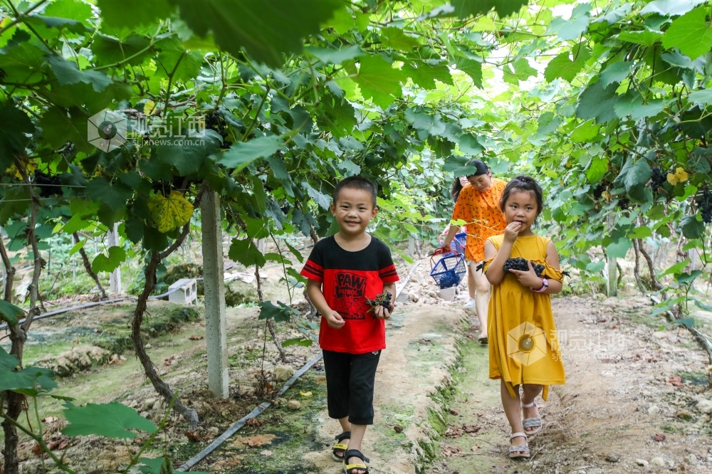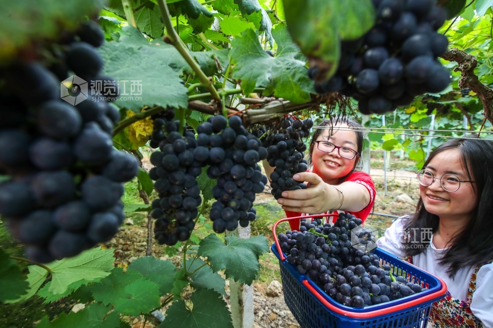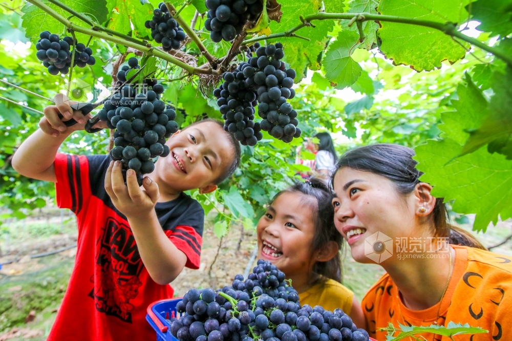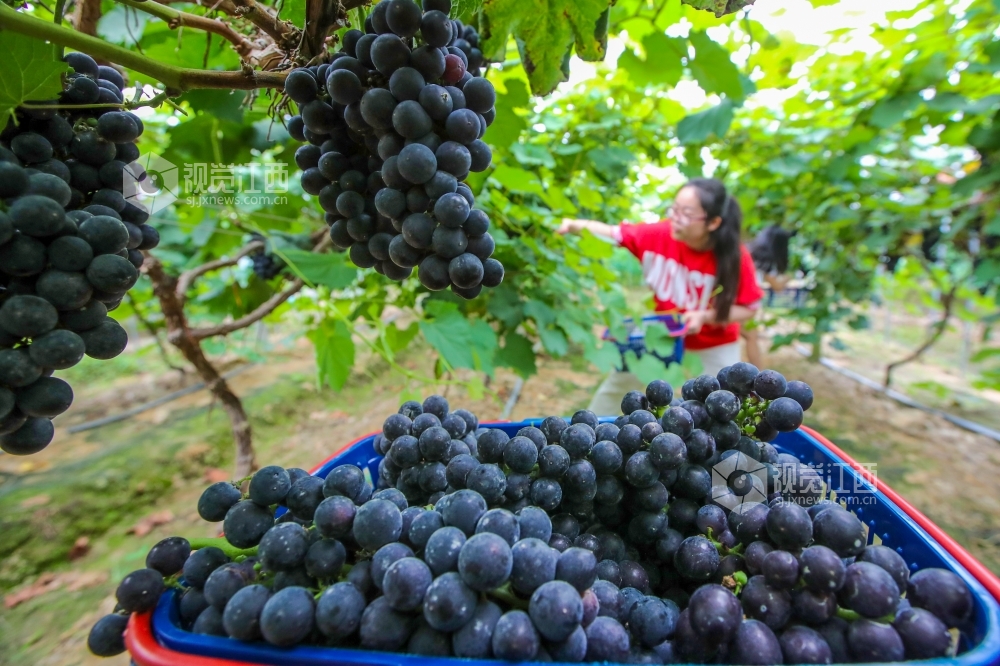 2020年6月19日,在江西省吉安市峡江县罗田镇产业扶贫基地,游客在采摘葡萄。近日,江西省吉安市峡江县罗田镇产业扶贫基地的葡萄陆续成熟,吸引了众多游客前来享受采摘的乐趣。近年来,峡江县不断调整产业结构,大力发展现代农业,共建设标准化乡村采摘园80余处,年接待游客突破40万人次。