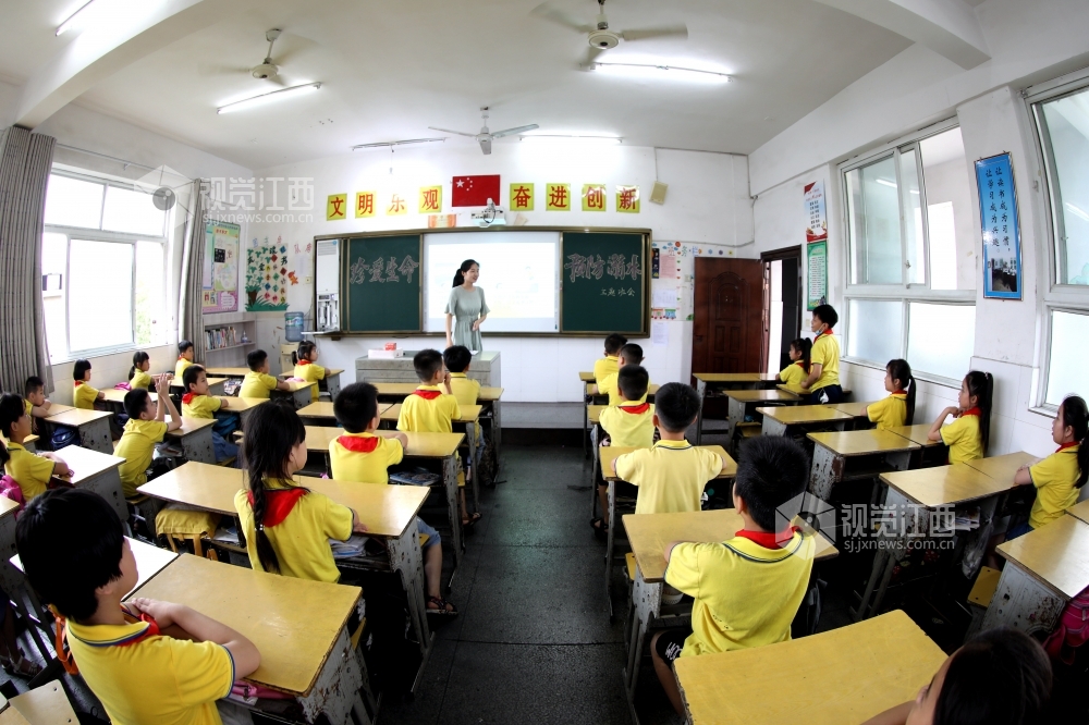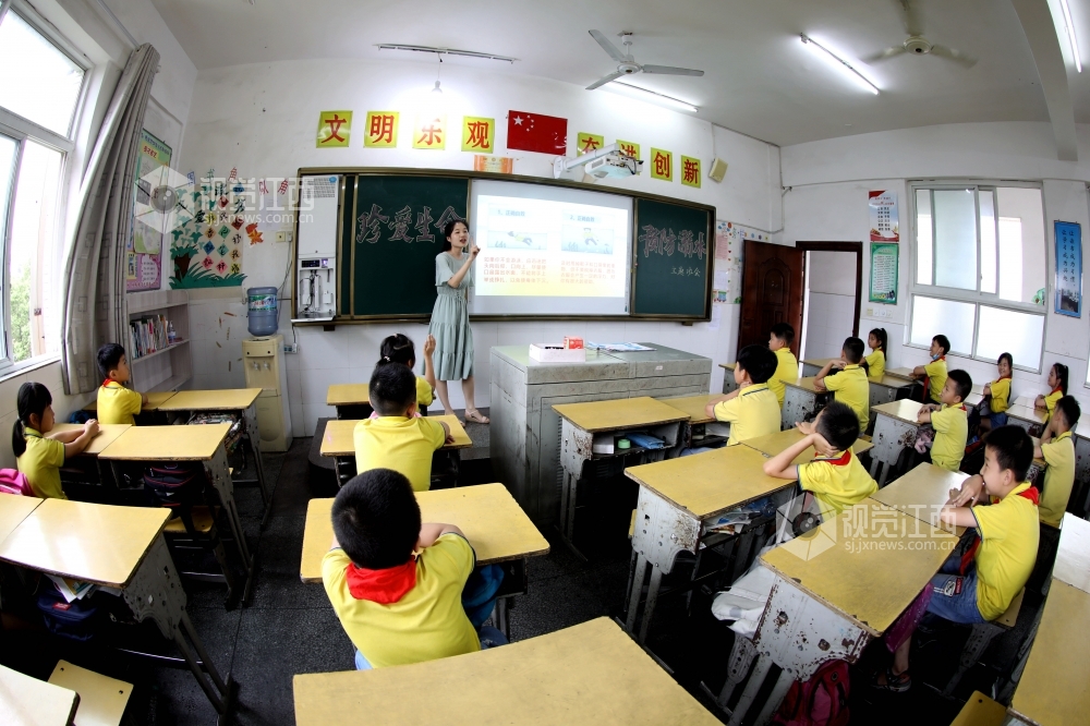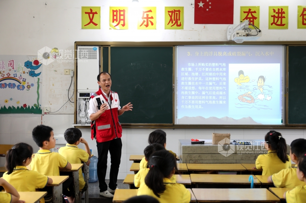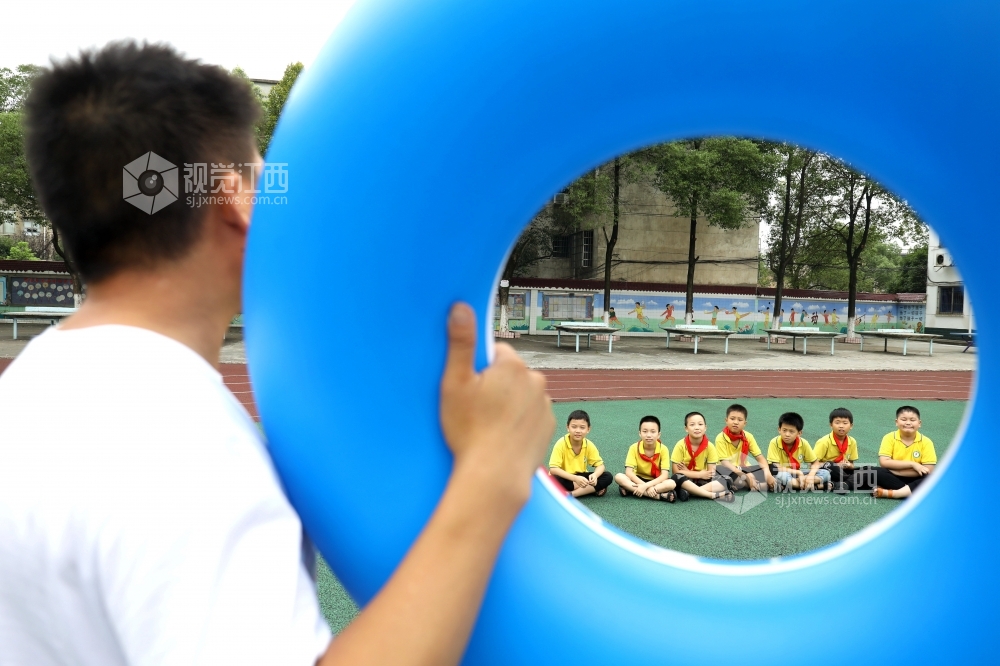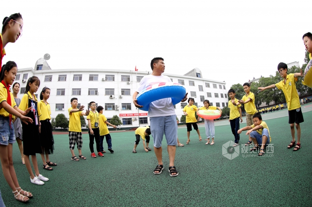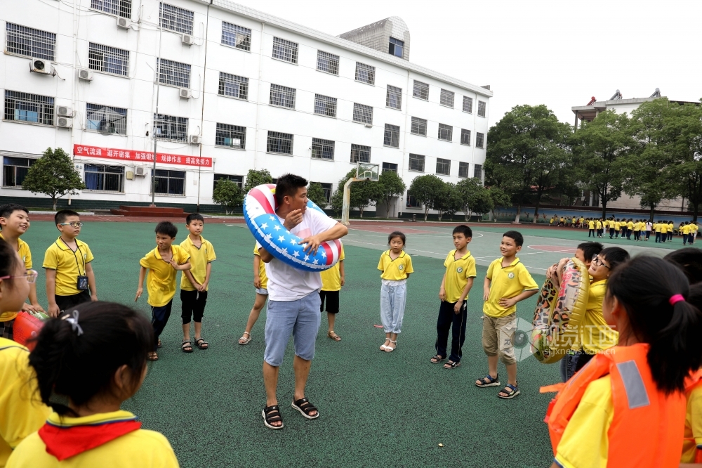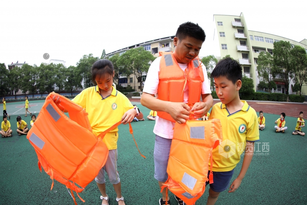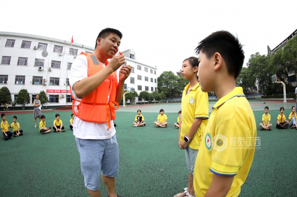 6月19日,江西省分宜县第二中心小学体育教师正在学校操场上给三年级学生讲解如何正确使用救生衣救生圈等安全知识。针对夏季是中小学生溺水事故高发期,连日来,分宜县整合学校、家庭、社会等多方力量,开展防溺水宣传,层层筑牢防溺水“安全网”。