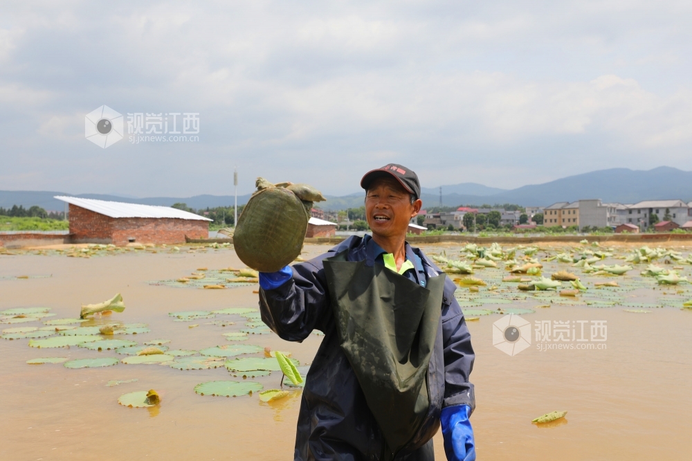 6月23日,莲花县路口镇庙背村甲鱼繁殖繁育基地内,负责人刘晓干正在捕捉甲鱼。该基地以“公司+基地+农户”形式,通过流转土地,合作养殖,发展稻鳖、稻鱼等特色生态农业,吸纳村民就业,带动村民共同增收致富。