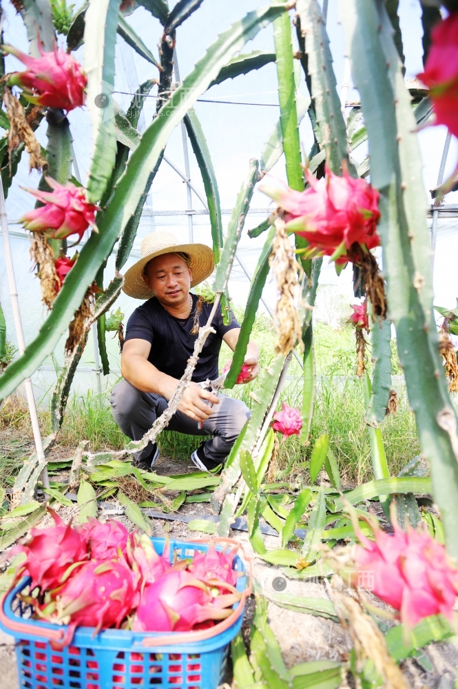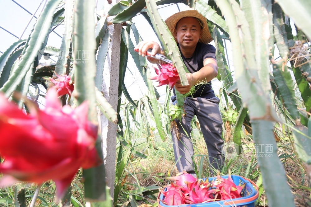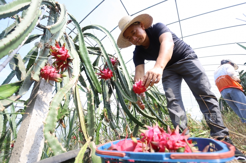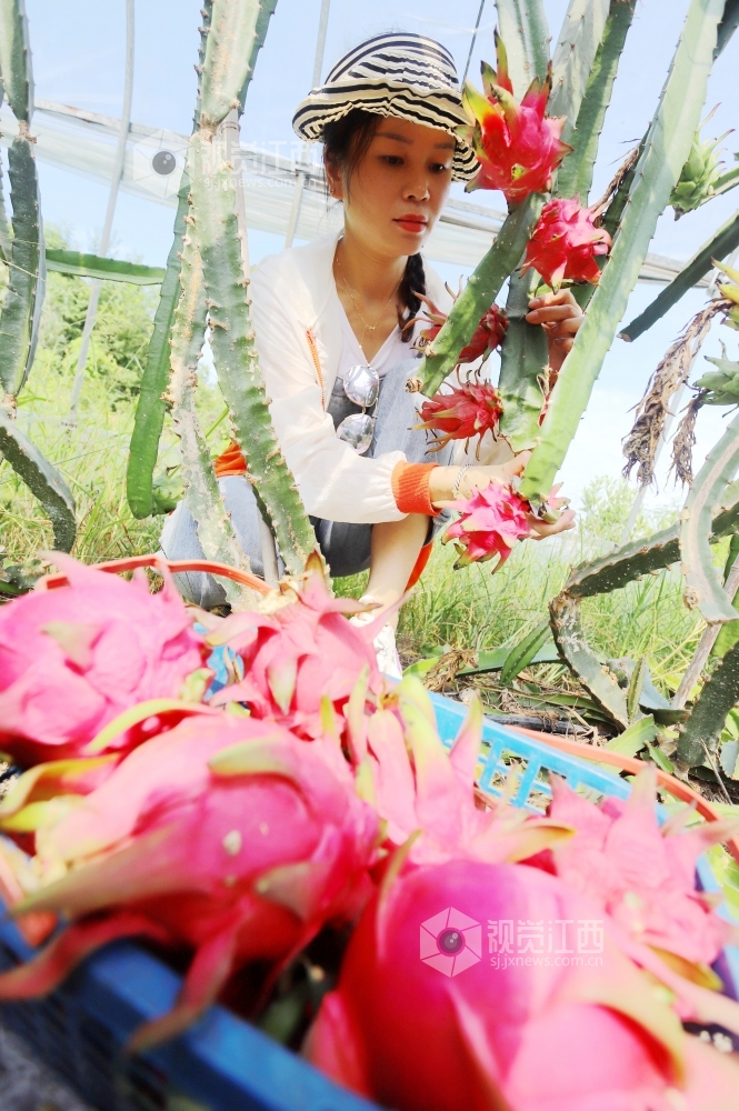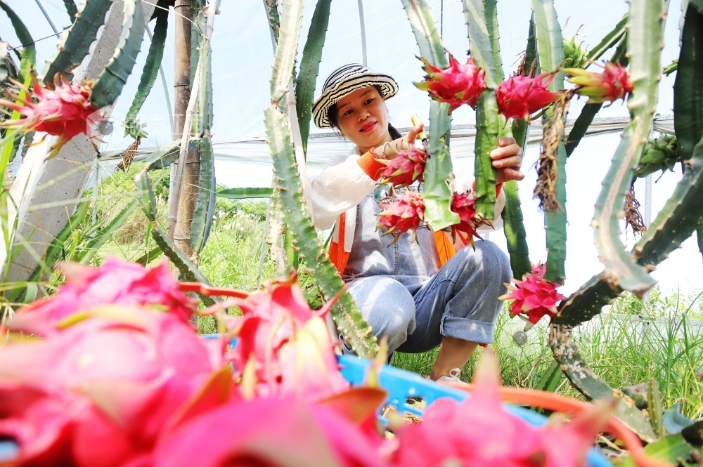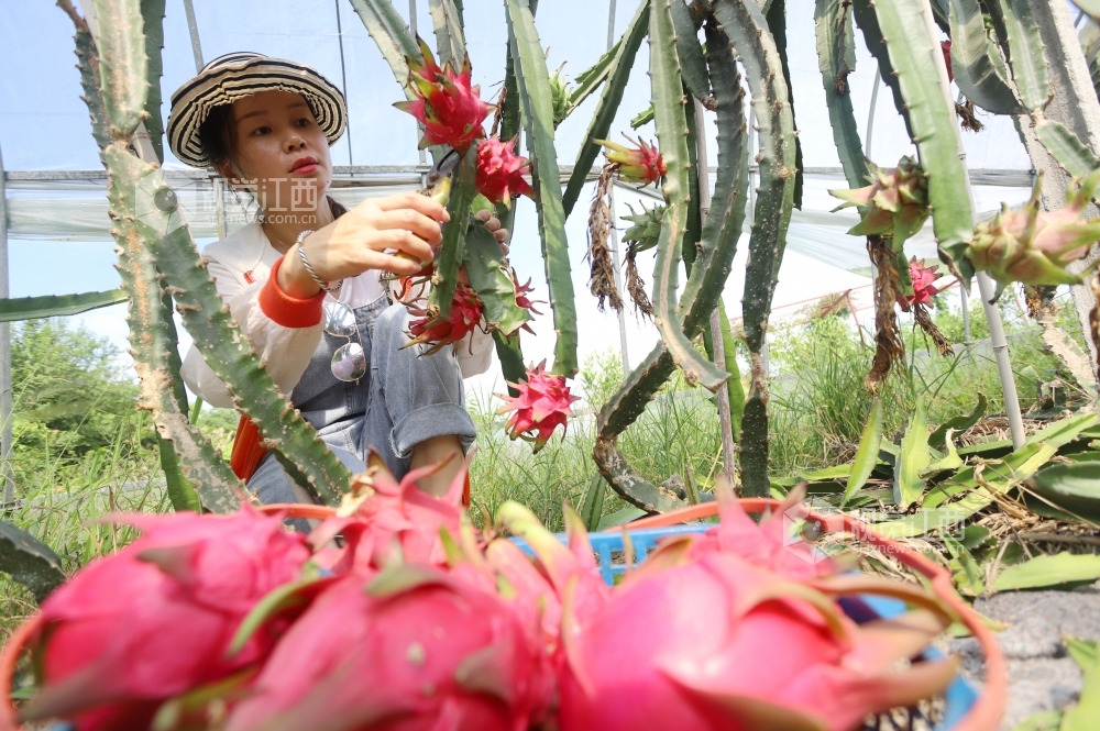 6月29日,安福县平都镇鲁洋田村福瑞家庭农场,游人在采摘火龙果。该农场占地120亩,由鲁洋田村返乡农民徐乐、欧阳锋创办,种植火龙果、桑葚、草莓、百香果等,眼下,福瑞家庭农场火龙果陆续成熟,迎来众多市民前去采摘体验。近年来,安福县积极推进农旅融合产业模式,财政资金奖补扶持返乡农民创办760余个集观赏游览和采摘体验为一体的家庭农场,带动了当地全域旅游和农民致富,促进了乡村振兴。